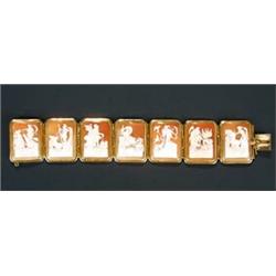 A Continental shell cameo bracelet, in the form of seven rectangular panels carved with neo-classical subjects, in plain frames, stamped 'K18', and a Collingwood case