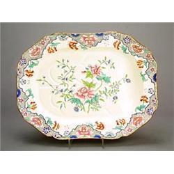 A Copeland and Garrett well-and-tree meat dish, enamelled in colours with an open spray of flowers within the popular 'Ship' border of stylised flowers on and around a shaped geometric ground, length 53.0cm, printed and impressed "Copeland & Garrett late Spode" marks and painted pattern number 3184 in blue, circa 1833-47 (see illustration) £80-120