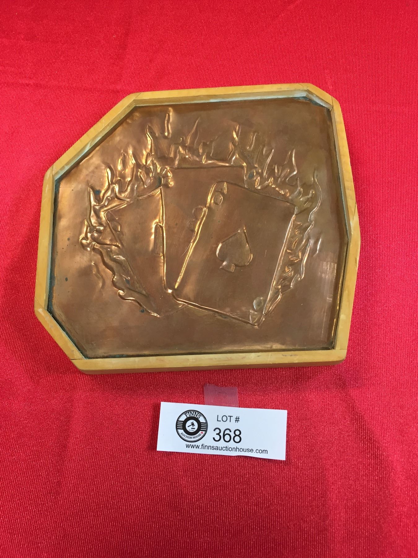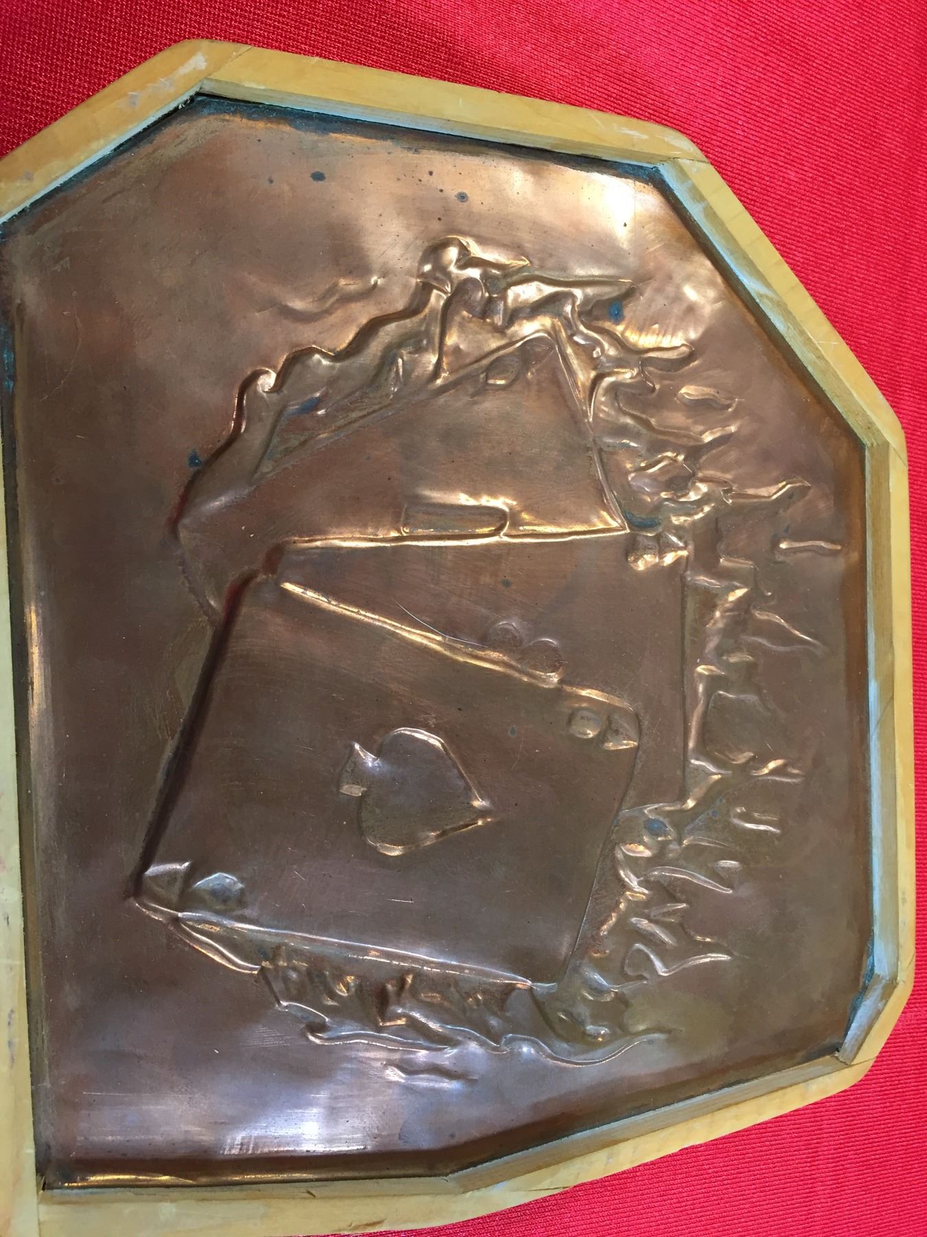 A Copper Art Piece with 3 Cards Embossed with Flames. Ace of Spades, Ace of Diamonds and Ace of Clubs. Nicely Done