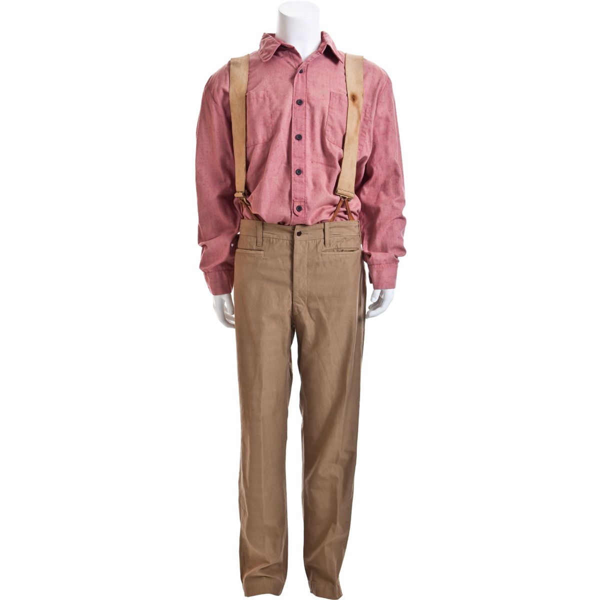 A Costume from "Big Jake." National General Pictures, 1971. A faded red raw silk shirt, long sleeves, two breast pockets, tuck-in tab on placket, Western Costume Co. label reads "No. 2150-1 / John Wayne / Chest 48 1/2 / Sleeve 36 / Collar 17 5/8;" together with a pair of tan cotton pants, WCC label reads "No. 2499-4 / John Wayne #1 / Waist 40 1/2 / Inseam 34 1/2," further WCC stamp on inside waistband; included with a pair of tan-colored elastic suspenders with brown leather trim; worn by Wayne in his first scene of the film where he and "Dog" save the Scottish sheep farmer as portrayed by Bernard Fox.