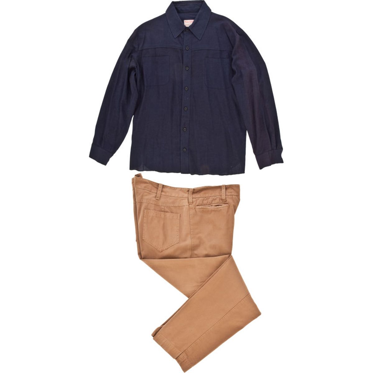 A Costume from "Chisum." Warner Bros., 1970. A navy blue light-weight wool shirt, long sleeves, two breast pockets, Western Costume Co. label reads "No. 2261-2 / John Wayne #2 / Sleeve 36 / Collar 17 5/8;" together with a pair of tan cotton pants, WCC label reads "No. 2499 / John Wayne / Waist 41 1/2 / Inseam 34 1/2," further WCC stamp on inside waistband; worn by Wayne in the film.