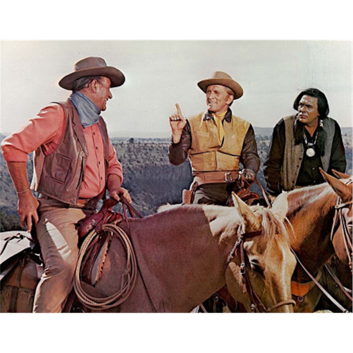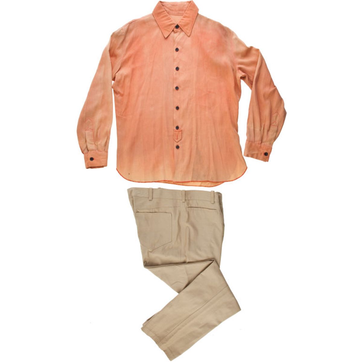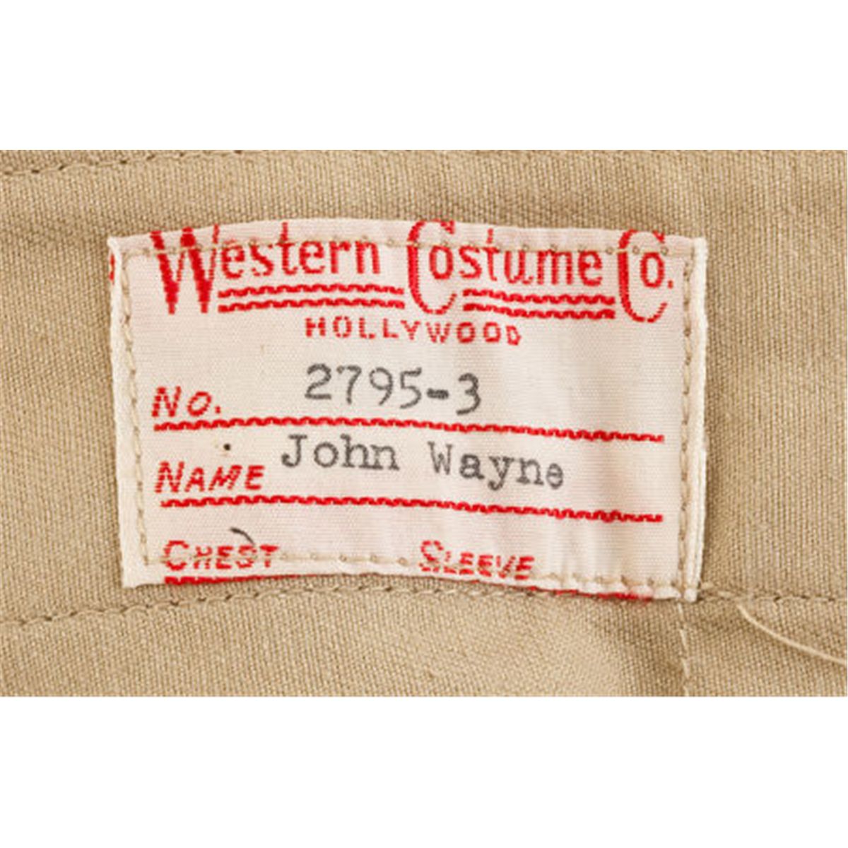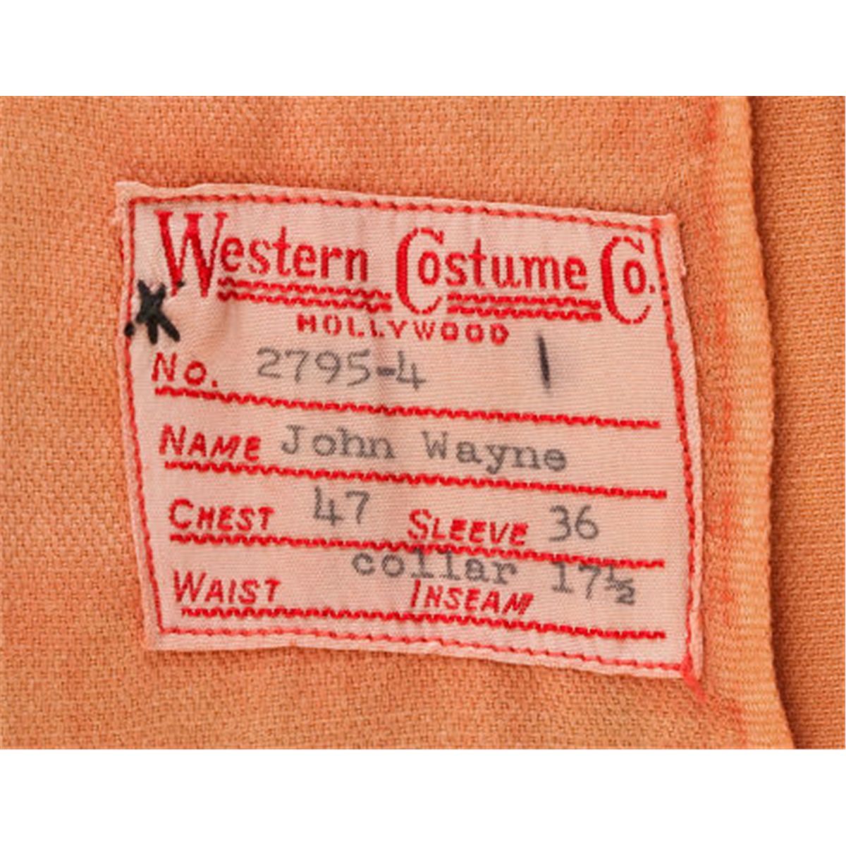 A Costume from "The War Wagon." Universal, 1967. A peach-colored cotton shirt, long sleeves, tuck-in tab on placket, Western Costume Co. label reads "No. 2795-1 / John Wayne / Chest 47 / Sleeve 36 / Collar 17 1/2;" together with a pair of tan pants, WCC label reads "No. 2795-3 / John Wayne;" worn by Wayne in the film. (Please note shirt has faded in an uneven pattern.)