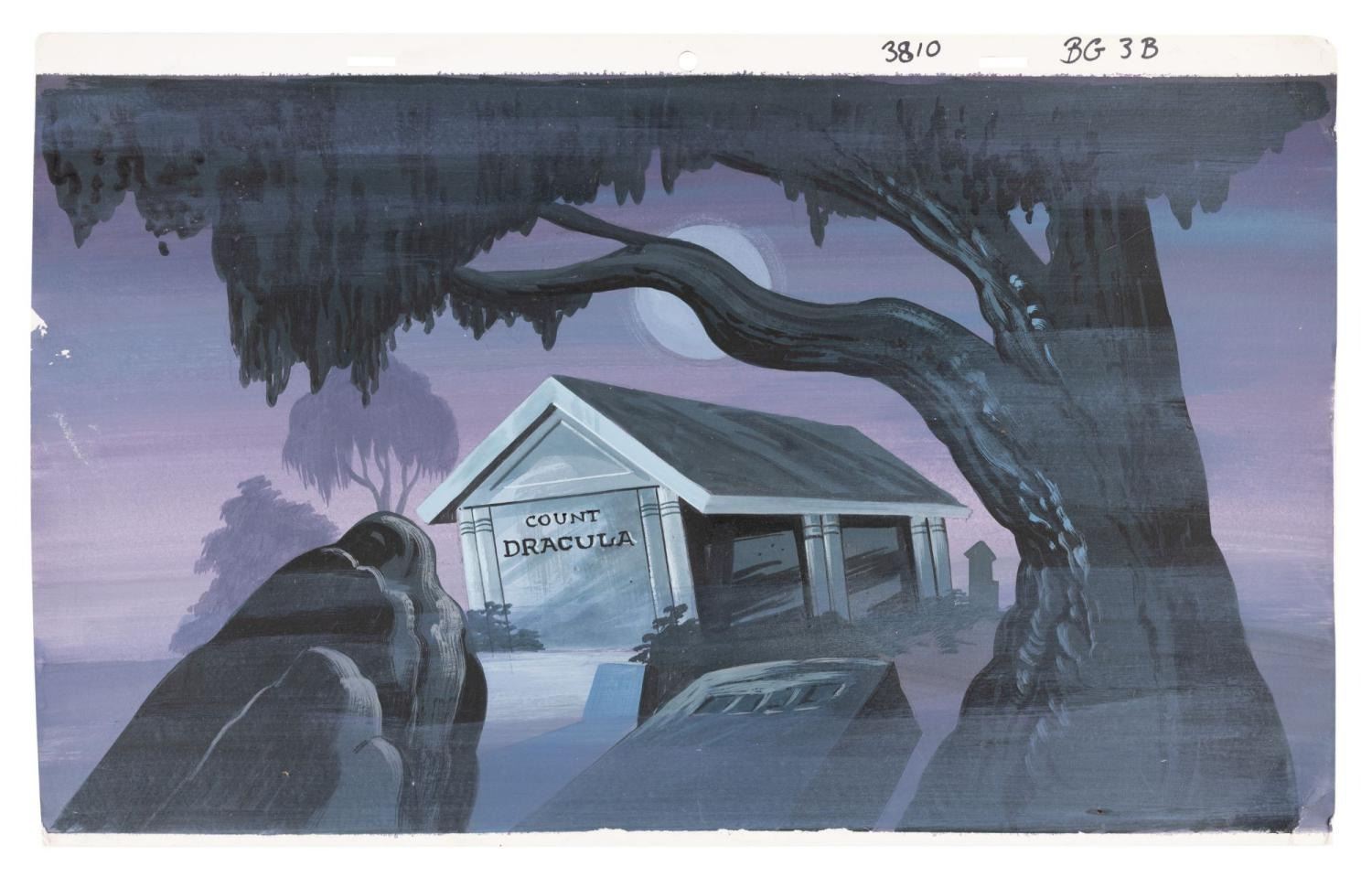(1970s-1980s) An original hand-painted production background from an unknown animated production featuring a graveyard with the tomb of Count Dracula. Measuring 10.5” x 16.75”, the background is in very good condition with a small area of paint loss to the left edge and general handling wear.