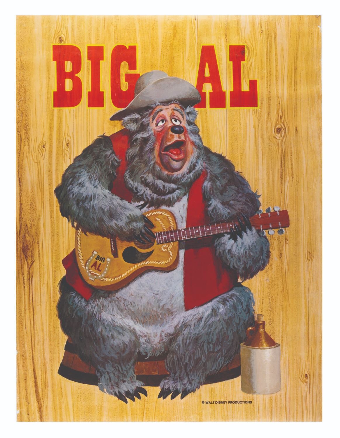 (Disneyland/Walt Disney World, 1970s-1980s) A souvenir poster featuring Big Al, the “Blood on the Saddle” crooner from the Country Bear Jamboree. Measuring 18” x 24”, the poster is in good condition with light edge wear, tape residue on the top right corner and reverse, and creases from storage.