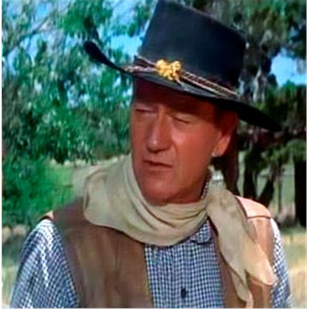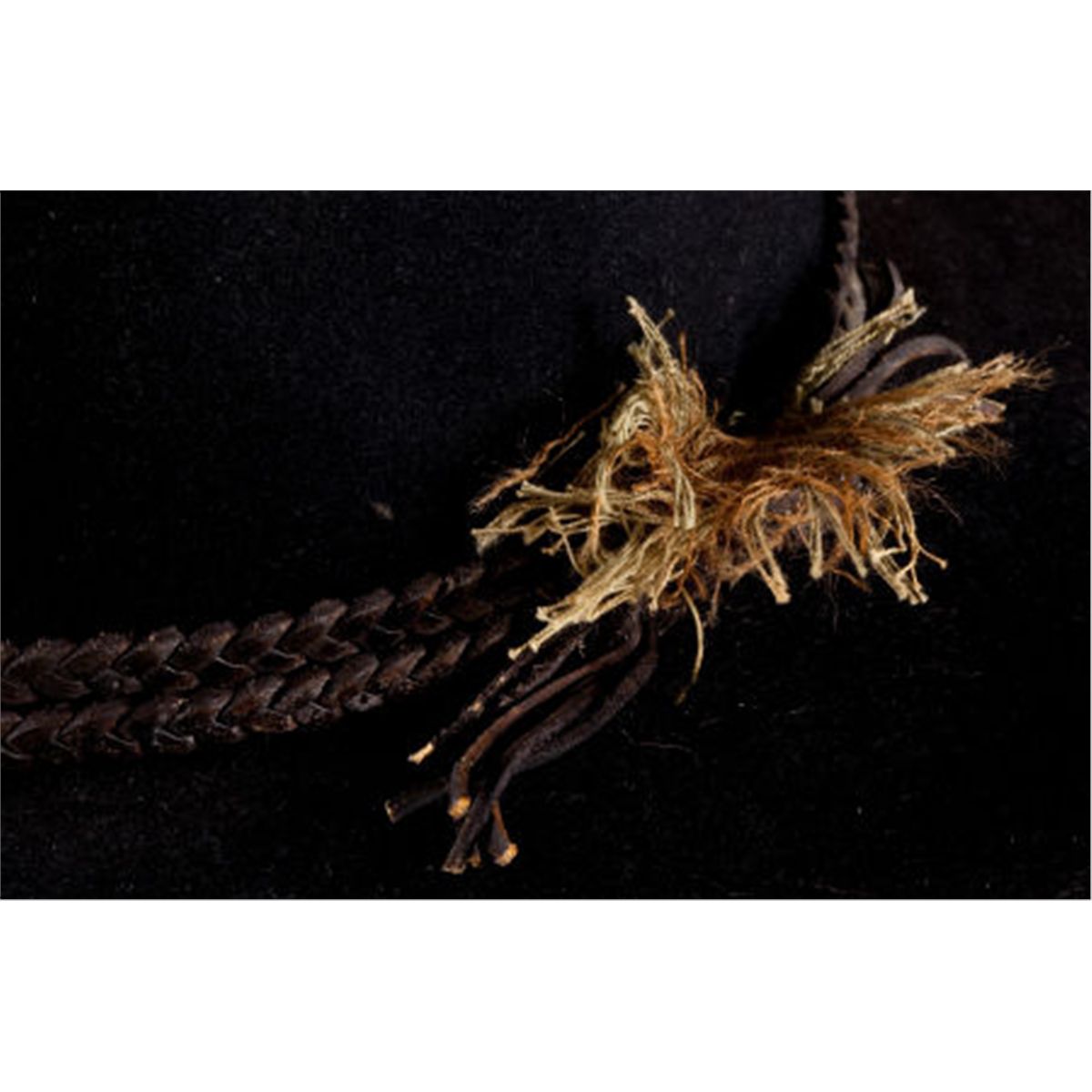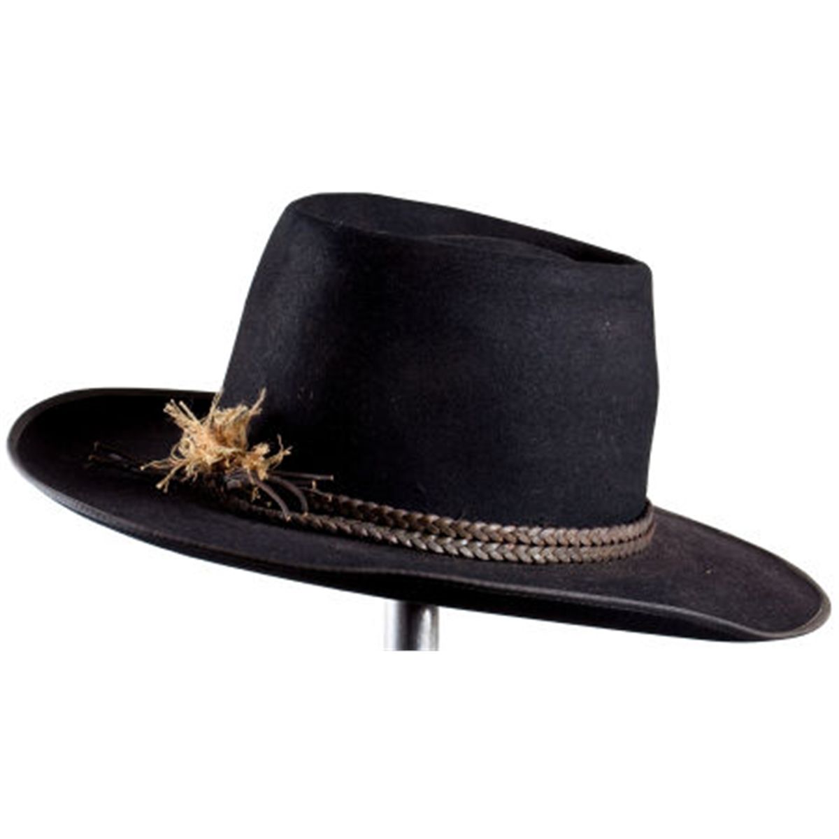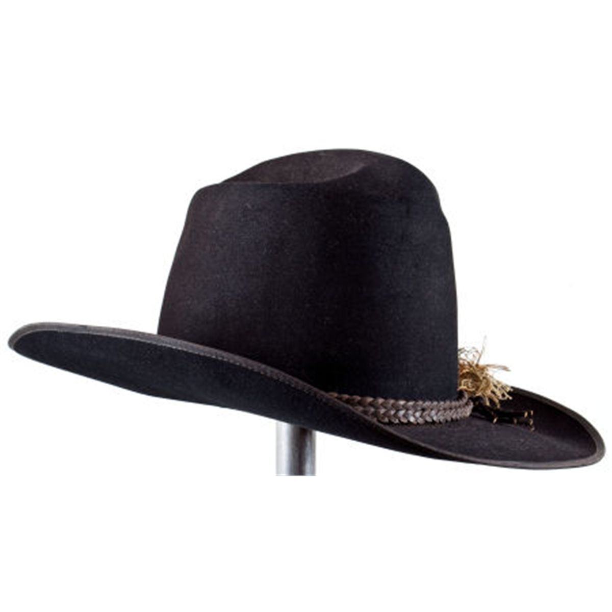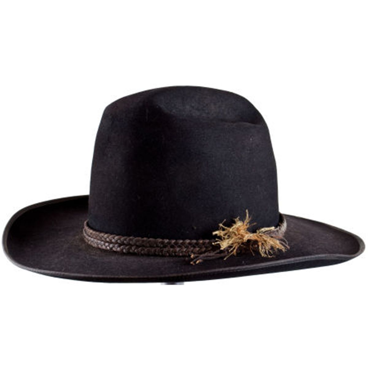 A Cowboy Hat from "The Comancheros" and Possibly "True Grit." 20th Century Fox, 1961; Paramount, 1969. Made of black felt, brown leather braid and twine hatband, inside stamped "W.C.C. 82 T" [Western Costume Company]; worn as Wayne portrayed "Ranger Captain Jake Cutter" in the film directed by Michael Curtiz and co-starring Lee Marvin and Patrick Wayne. According to Luster Bayless [Wayne's longtime costumer] in the 1996 book, "Duke, We're Glad We Knew You," by Herb Fagen, Wayne's "hat [from "True Grit"] was the same one he used in "The Comancheros" and "The Alamo." We just changed the block around." (Please note this hat is dusty and shows signs of wear.)The current hatband on this hat seems to be the one from "True Grit" but minus a ribbon.