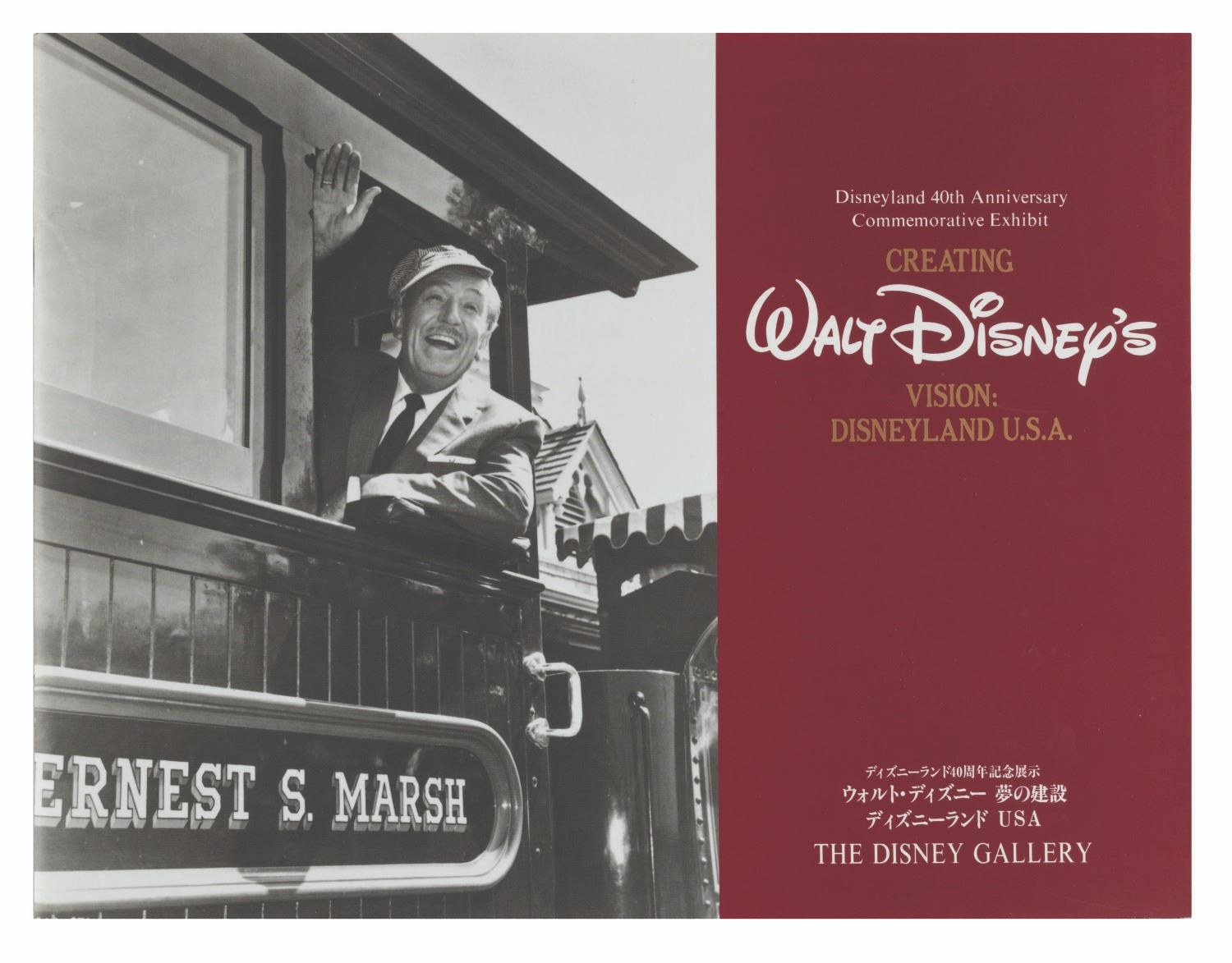 (Tokyo Disneyland, 1995) A copy of Creating Walt Disney's Vision: Disneyland, USA. The 29-page book, written in Japanese and English, commemorates the 40th anniversary of Disneyland exhibit at The Disney Gallery. The book contains a foreword by Marty Sklar and color photos of concept art and attraction posters. Measuring 8.5” x 11”, the book is in good condition with scratches, light stains, and a red mark on the first page.