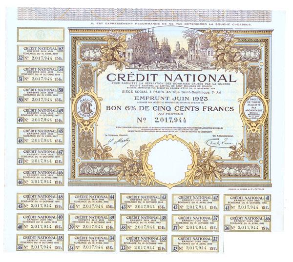 June 1923, France. A 500 francs bond bearing 6% interest “for the repair of the damages caused by the war”. Yellow, brown and green on white paper. Top center vignette of a damaged village undergoing major repairs, complete with scaffolding. Coupons attached at bottom and the left. Lightly punch cancelled and in very fine condition.