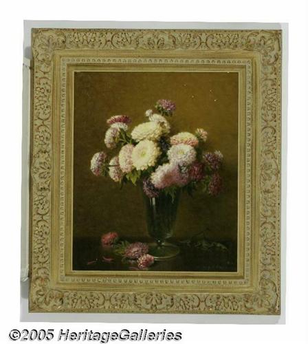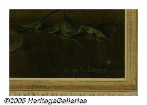 <B>A.D. GREER (American 1904-1998)</B></I><BR>Mums<BR>Oil on canvas<BR>24in. x 20in.<BR>Signed lower right<BR><BR>Condition Report: Substantial mold spotting across back of canvas, significant lifting of paint surface in upper area of painting with some flaking and loss, light surface dirt<BR>