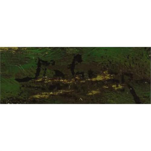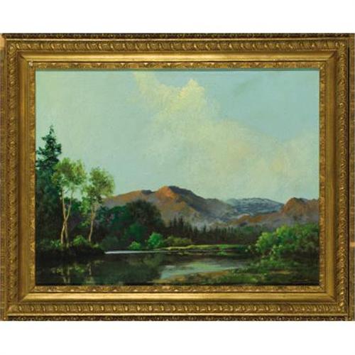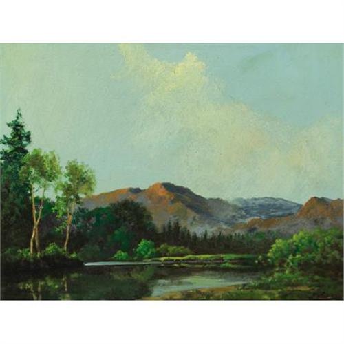 <B>A. D. (Aubrey Dale) GREER (American, 1904-1998)</B></I><BR><I>Mountain Lake</B></I><BR>Oil on masonite<BR>14 x 18 inches (35.6 x 45.7 cm)<BR>Signed lower right: <I>A D Greer</B></I><BR> <BR>PROVENANCE:<BR>Bosque Crossing Gallery, Clifton, Texas<BR>