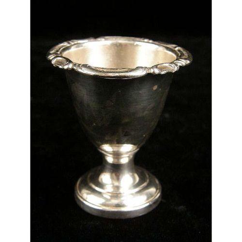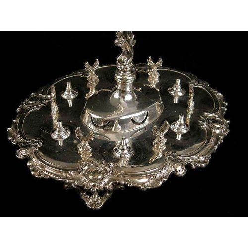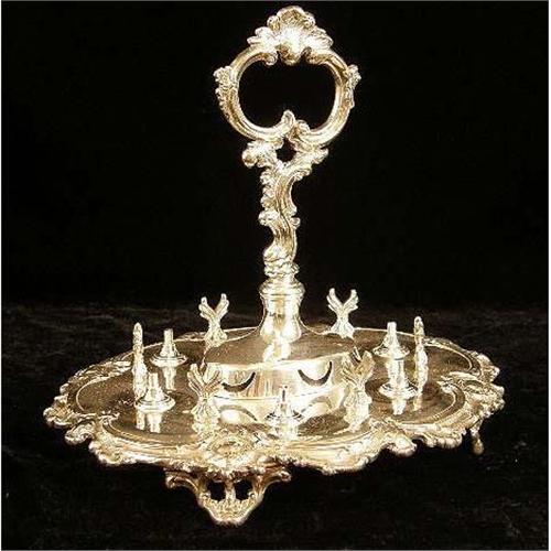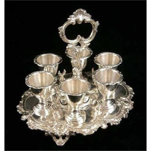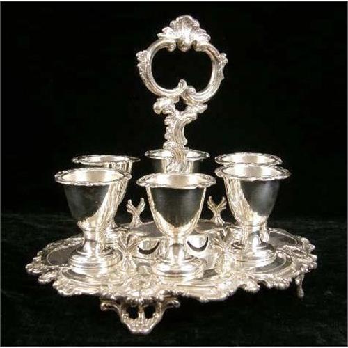 A D & S ROCOCO SILVER ON COPPER HANDLED FOOTED SHAPED OVAL EGG CUP STAND<BR><BR>With six footed cups, shell and scroll motif, 9"high over handle, 9-1/2"long