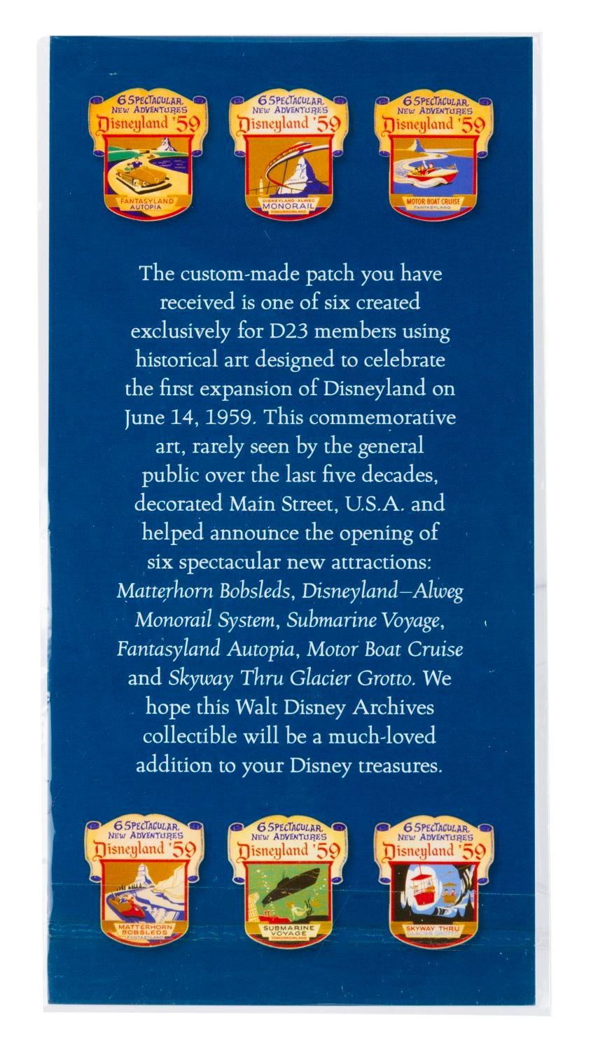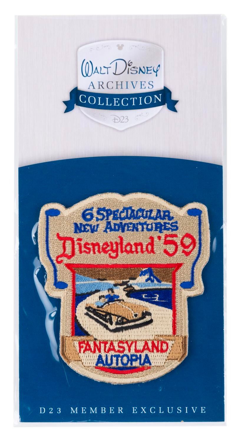 (Disneyland, 2009) A D23 exclusive Autopia Patch. The patch was one of six randomly selected and included in the 2009 Fall issue of D23 magazine, which recreated Main Street, U.S.A. lamppost signs announcing the opening of six new attractions in 1959. The patch measures 3.25” x 3” and is presented sealed on a backer card measuring 7” x 3” and is in fine as-new condition.