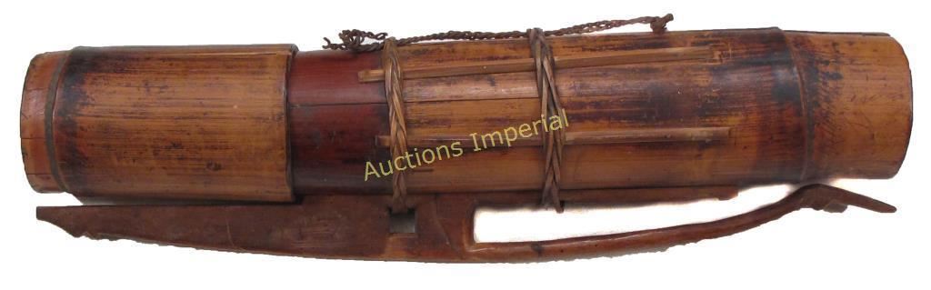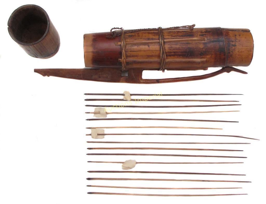 Made from a section of bamboo with fitted cap, and carved wooden hook retained by rattan. Containing bamboo darts, some retaining their cotton plugs. Early 20th century. Worn. Overall length 37.5 cm.