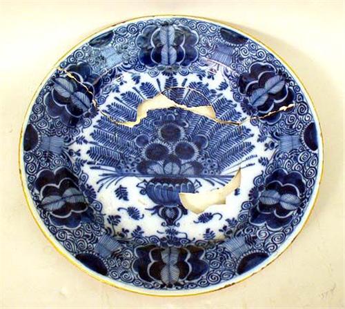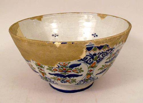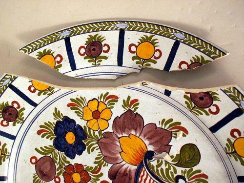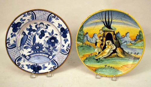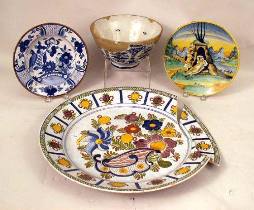 Chips and breaks. 16 3/4"d. Together with a Delft bowl and plate, a blue floral decorated Delft charger, severely broken, and a polychrome decorated plate. Chips, cracks, peeling, and breaks. 5 pieces.