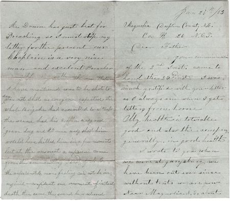 War date A.L. of Pvt. Noah Deaton of the 26th North Carolina Infantry, 4pp. 12mo., "Magnolia Dauphin County, N.C." Jan. 25, 1863 in ink and pencil to his father reporting on the impending execution of a deserter and other matters: "...We have been out ever since without tents... some think we will go back to Petersburg, Va. & others that we will go towards Newbern, N.C. or to Wilmington... There is a man of our Regt. Co. B. to be shot to death tomorrow... for Desertion. He left camp at Garysburg about a week ago. He was overheard in making his plot with three others by a private who without saying anything about it went and posted himself on the road and as the deserters came up he halted them and brought them back to camp. I cannot help but feel sorry for the poor fellow to see him bound down a waiting for to be shot tomorrow but he knew the penalty before he deserted. The drum has just beat for preaching so I must stop my letter for the present... Monday the 26th. The man that I have mentioned was to be shot today was not shot as everyone expected. The whole brigade had assembled to witness the scene had his coffin ready and grave dug and 20 men ready to shoot him. Would have killed him in a few moments but at the moment a reprieve came from the Commanding Gen'l of N.C. The unfortunate mans feeling can not be imagined, confident one moment of instant death then came the sound he is released." Letter incomplete, usual folds, light soiling, else very good.