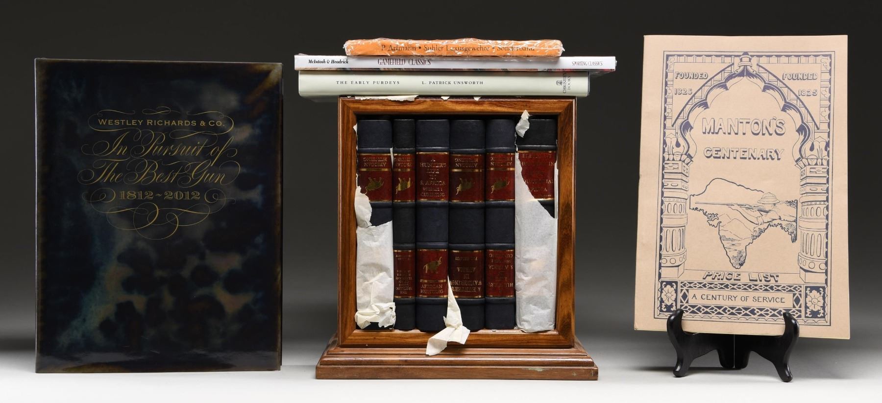 EARLY GUNMAKERS & AFRICAN HUNTING. Lot contains books consisting of: No.1: "The Early Purdeys" by Unsworth. Signed copy. / No.2: "Westley Richards & Co. In Pursuit of the Best Gun" by Musson. In wrapper. / No.3: "Suhler Luxusgewehre" by Arfman. In sealed wrapper. / No.4: Six volume set. "African Hunting Reprint Series by, Books of Zimbabwe, Bulawayo, 1981" in a wooden display case. "A Hunter's Life in Africa Volume 1 & 2" by Cumming, "The Recollections of an Elephant Hunter 1864-1875" by William Finaughty, "Hunter's Wanderings in Africa" by F. C. Selous, "Elephant Hunting in East Equatorial Africa" by Neumann & "African Hunting and Adventure" by WM. Charles Baldwin. / No.5: "Gamefield Classics" by McIntosh & Headrick. In sealed wrapper. CONDITION: books are in excellent condition w/ very little handling wear. Wooden case has very little handling wear, but retains remnants of paper wrapping. PROVENANCE: from the renowned collection of quality sporting arms from Lewis Drake together with inventory of Lewis Drake Associates. (02-23570-8/RW). NON-GUN. $700-900.