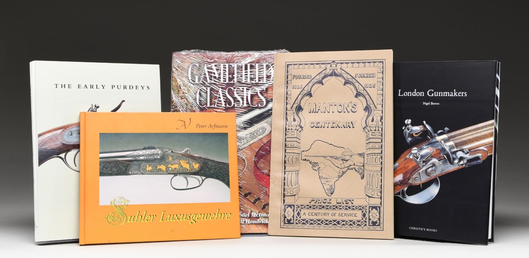 EARLY ENGLISH AND EUROPEAN QUALITY SPORTING GUNS. Lot contains books consisting of: 1) "The Early Purdeys" by Unsworth. Signed copy. 2) "London Gunmakers" by Brown. 3) "Suhler Luxusgewehre" by Arfman. 4) "Gamefield Classics" by McIntosh & Headrick. 5) "Manton's Centenary". Reprinted catalogue. CONDITION: books are in excellent condition w/ very little handling wear. PROVENANCE: from the renowned collection of quality sporting arms from Lewis Drake together with inventory of Lewis Drake Associates. (02-23570-14/RW). NON-GUN. $500-700.