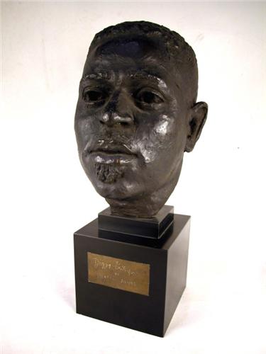 A DEXTER JONES BRONZE PORTRAIT BUST OF DIZZY GILLESPIE 21"h, together with two black and white photographs depicting the Dexter Jones Bust, 3 pieces