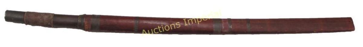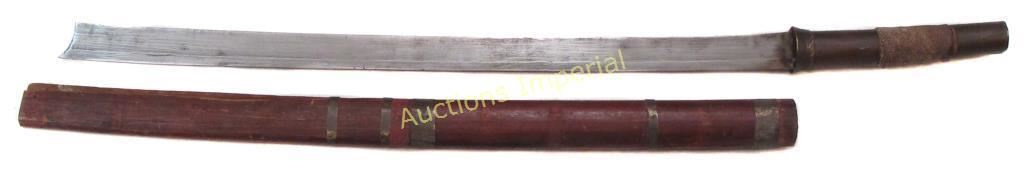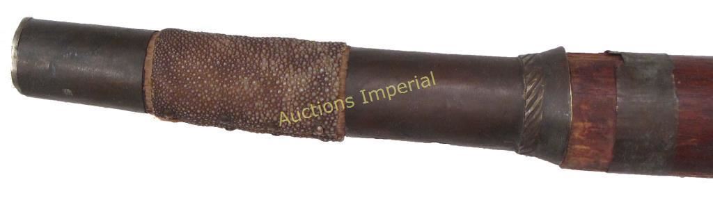 The brass-mounted hilt with rayskin grip. Well-forged blade with concave tip and raised, chamfered edge. In its wooden sheath with brass bands. Late 19th-early 20th century. Minor abrasions. Overall length 7`.6 cm.