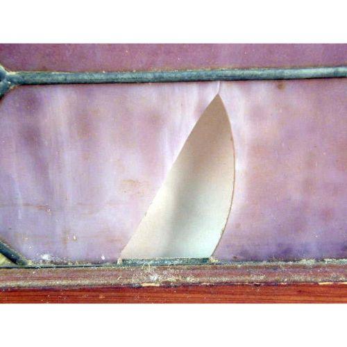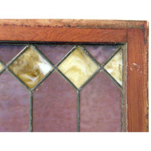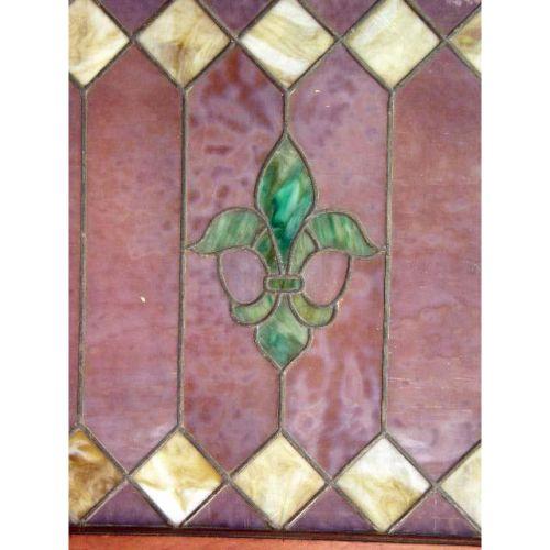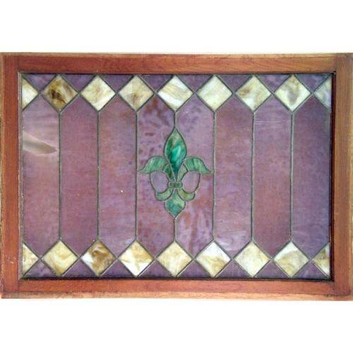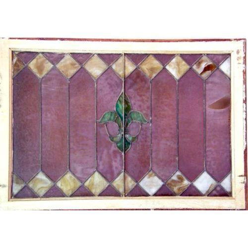 A DIAMOND AND FLEUR-DE-LIS PATTERN STAINED GLASS WINDOW<BR><BR>28"h x 40"w x 1-1/2"d, missing a 4-1/2"h x 2"w piece of glass.