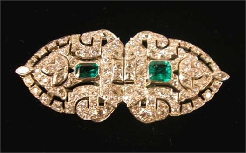 A DIAMOND, EMERALD, 18 KT WHITE GOLD, AND PLATINUM ART DECO BROOCH; pin in a double shield shape which can be separated and either worn individually or as one pin, two emeralds, 8 Marquise diamonds, 4 square cut diamonds are all bezel set, 112 old European cut diamonds in a bead set, 4 square diamonds est. weight .48 ct, 8 mounted marquise est. weight 1.04 ct, 112 old European cut diamonds est. weight 3.70 ct.