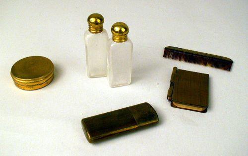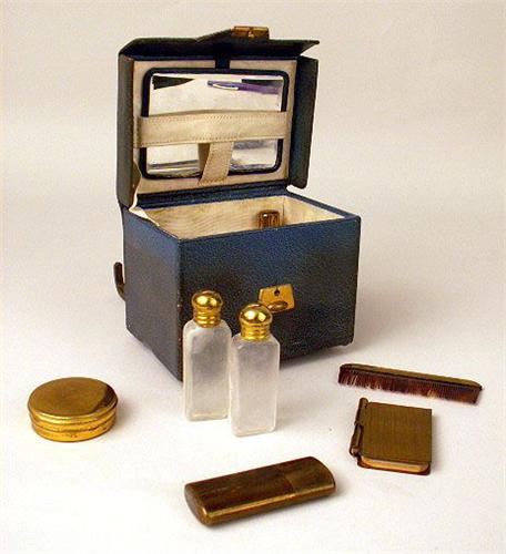 The interior fitted with gold tone and glass travel items, including a note holder with pencil, a circular pill box, and refillable bottles. Wear. 3 1/4"h x 4 1/2"w x 3"d.