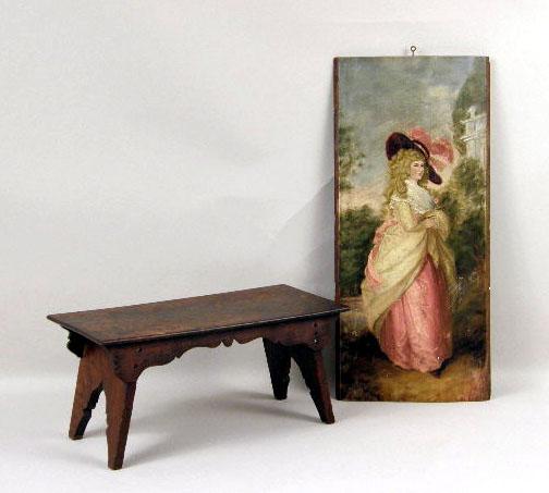 Together with an oil on board portrait of an elegant woman wearing a hat. 2 pieces. The stool 6"h x 14"w x 7"d, the painting 19"h x 8 1/2"w Repairs.
