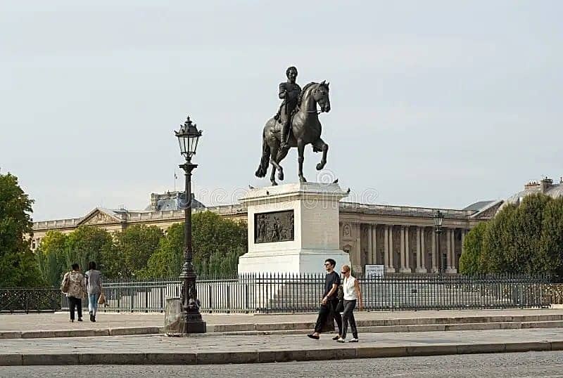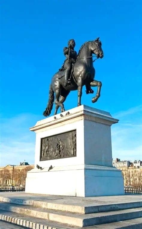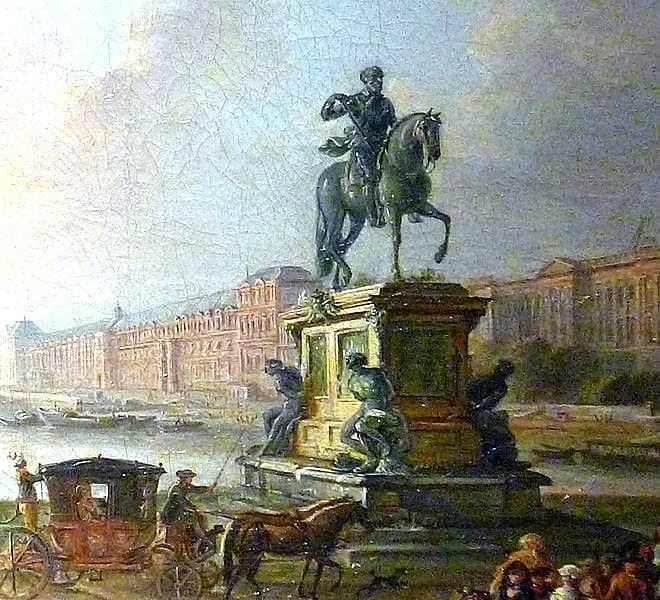 1 Large 18th C. under glass of the statue of Henri IV. This steel engraved paper under glass with a sky blue background depicts the famous statue of Henri IV set on the bridge Pont Neuf in Paris France. The original statue was erected in 1614 but torn down in 1792 during the French Revolution and rebuilt in 1818. This depiction is obviously a depiction of the original statue and was therefore created certainly before 1792 and perhaps many years prior. A finely detailed example and in fine condition. We have attached some renderings and photos of the bridge and statue of today.