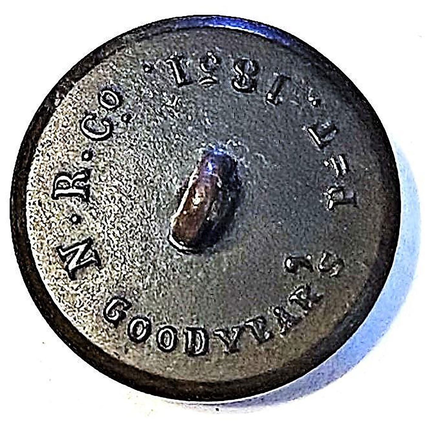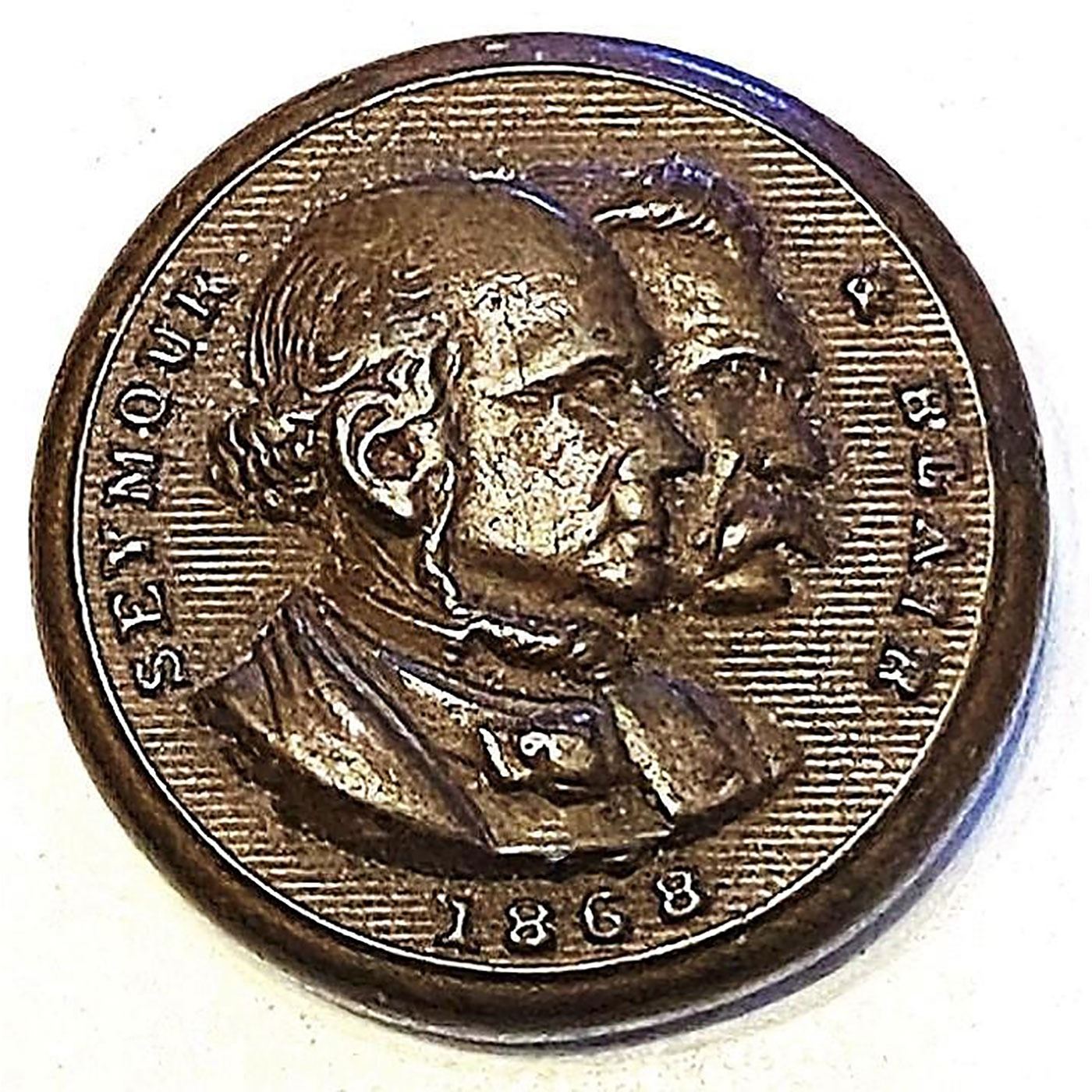 1 Med. very rare 19th C. Political Rubber for Seymour & Blair. This brown molded backmarked Goodyear Rubber button was made as a campaign button for the Presidential democratic candidates in 1868 for Seymour and Blair. A very hard button to find.