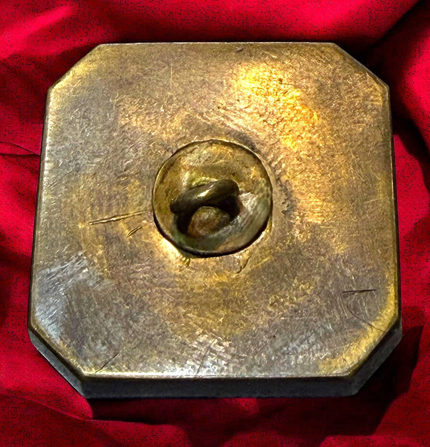 1 Medium square 19th century relief Shakudo example with DF. Here is a wonderful example of Japanese metal works known as Shakudo. The detailed figures are accented with a rare find in this type of button, a paint DF, yes that’s a rare thing to find on Shakudo buttons and this example is in great condition.