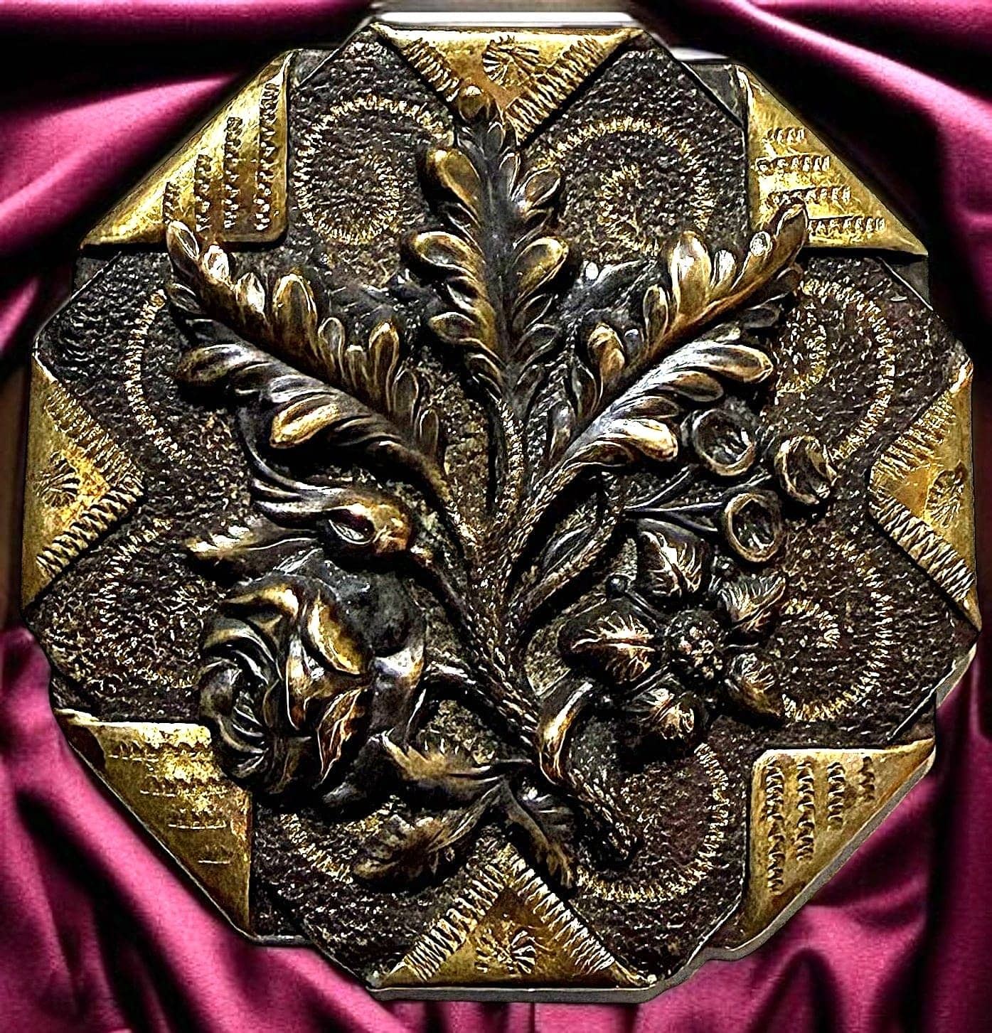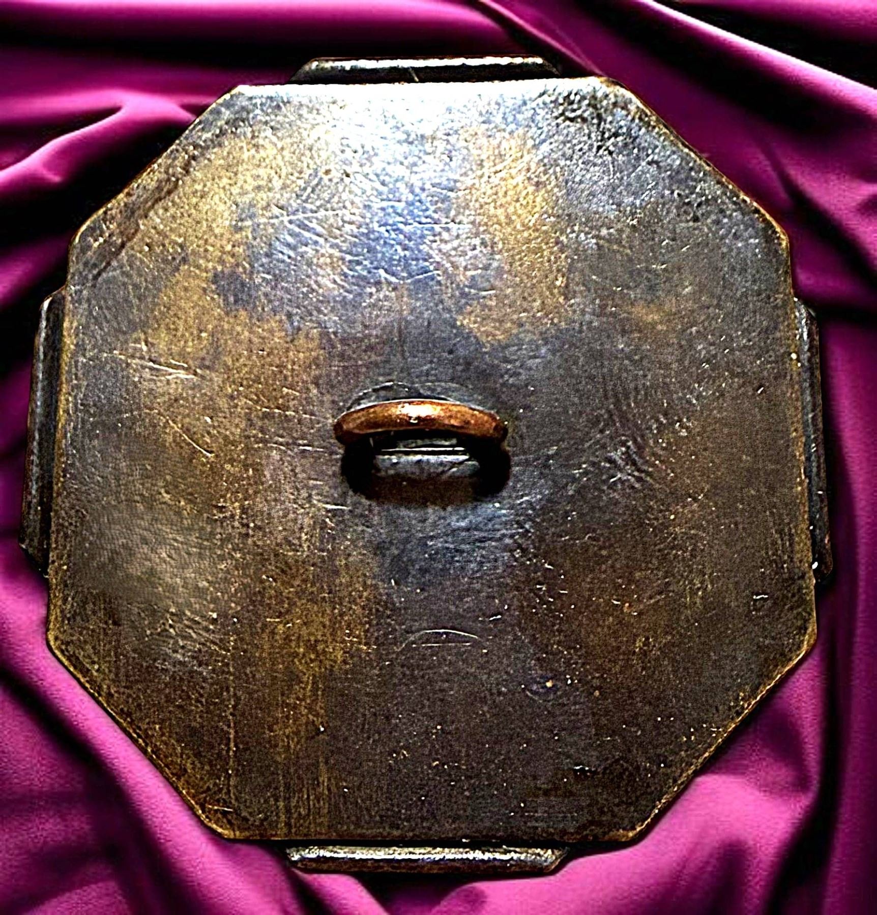 1 Large 19th century detailed handkerchief corner button. This stunning condition desirable 8 corner handkerchief corner example has a beautiful tole background. A very desirable button.