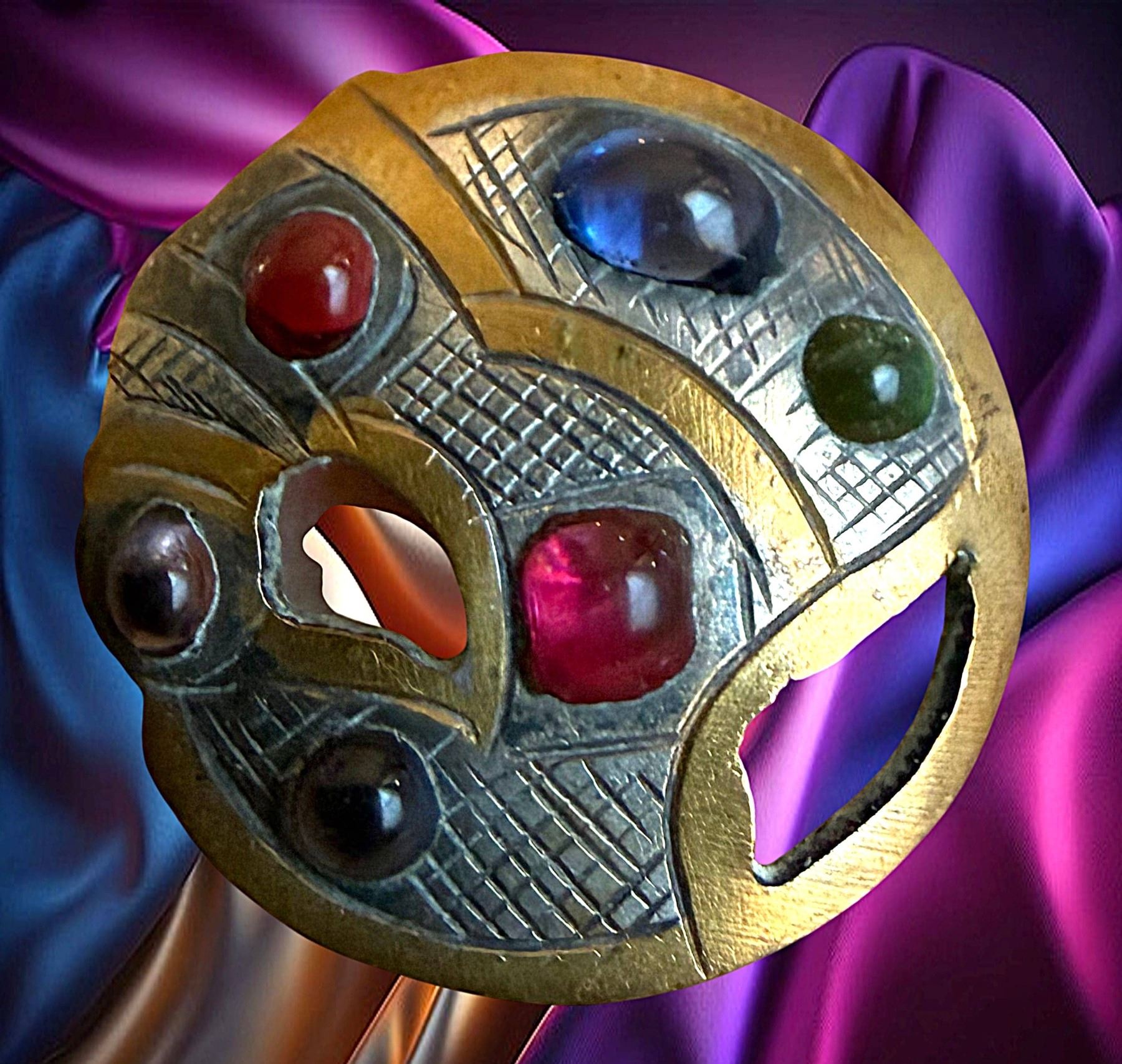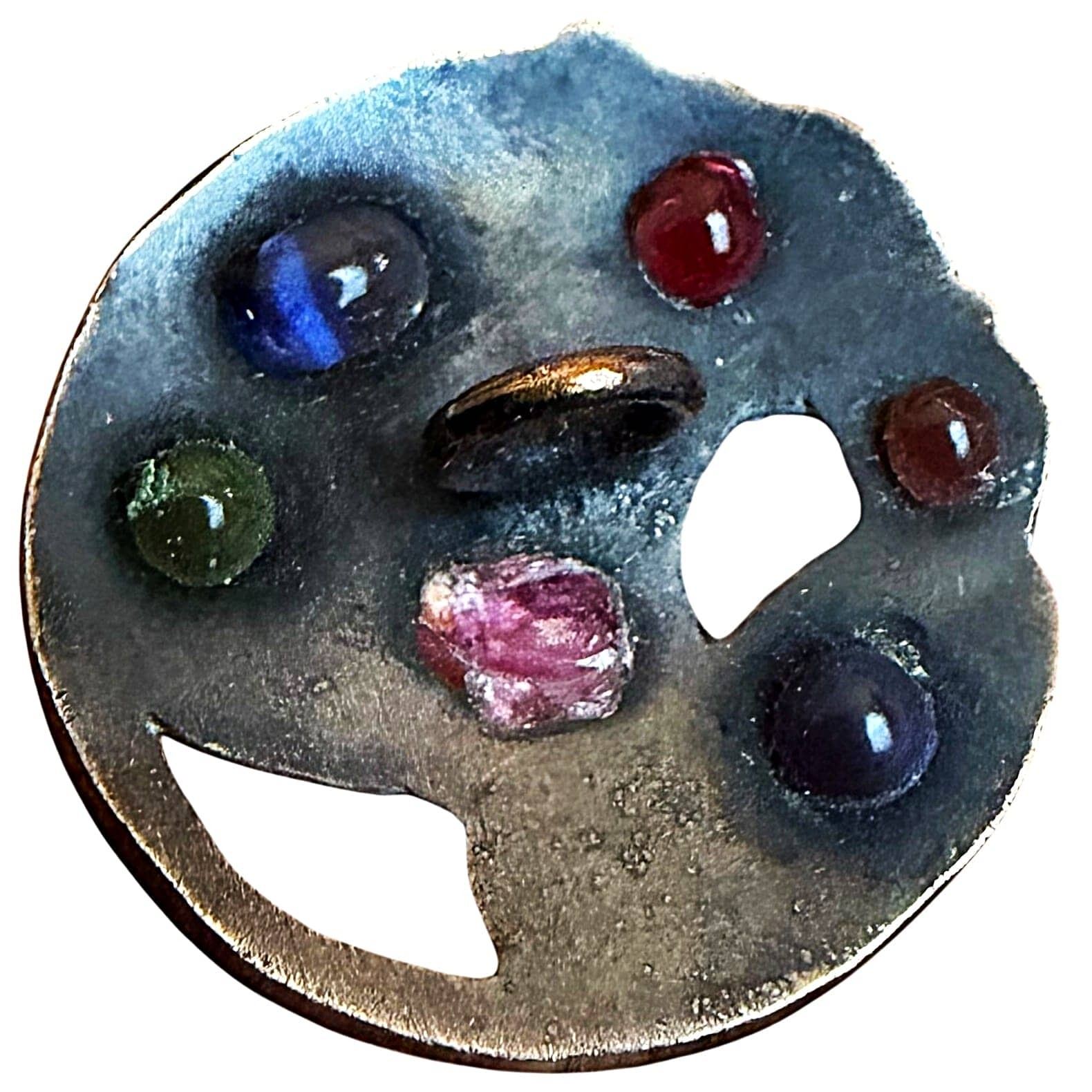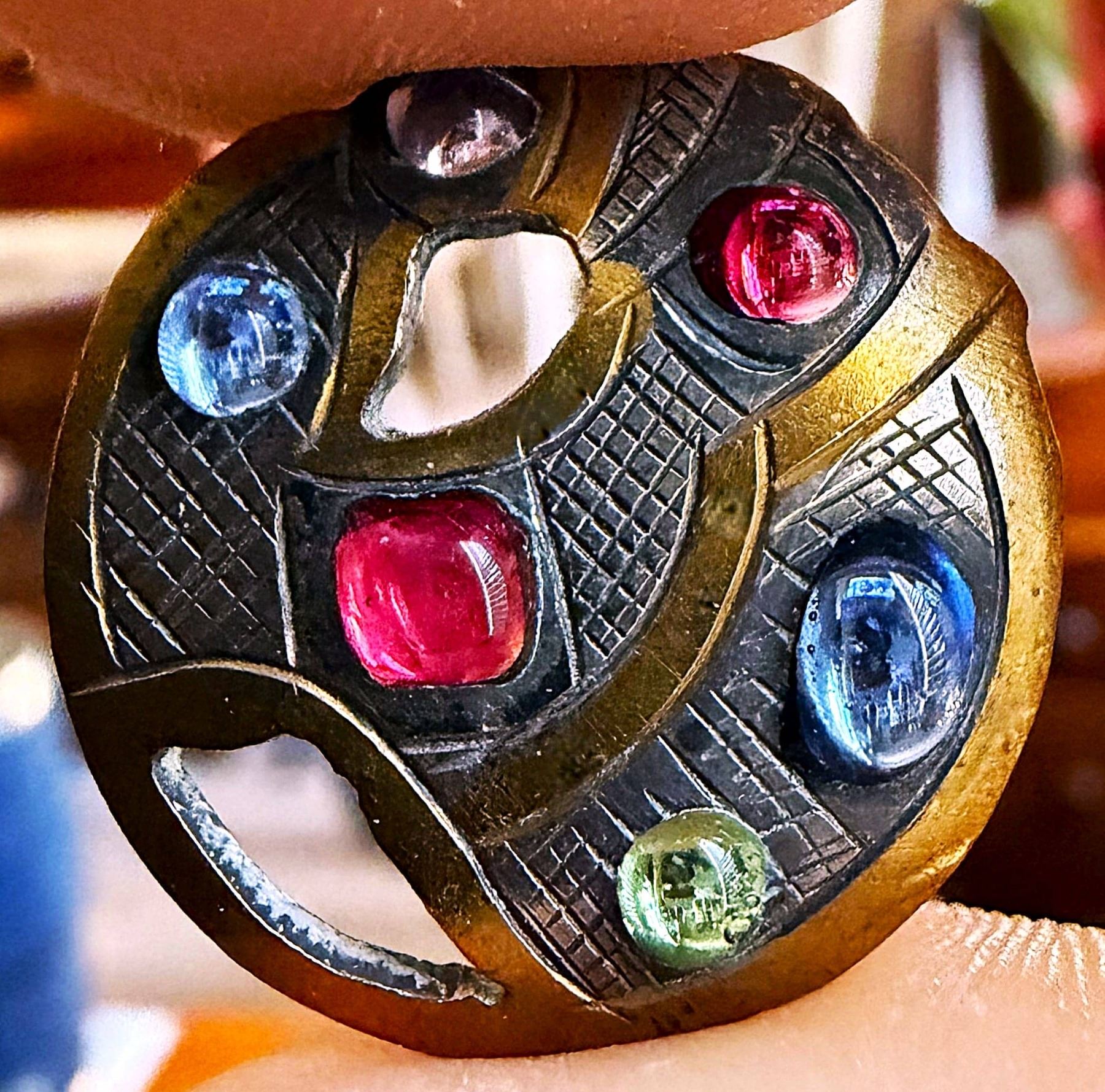 1 Medium size early 20th C. Arts & Crafts Plique a Jour example. Here is a multi colored French technique enamel known as Plique A Jour enameling. A variety of colors have been used as the transparent enamel sections of pinkish, light blue, light green and clear, The brass setting is in the arts and crafts style and engraved, A lovely late 19th early 20th century example.