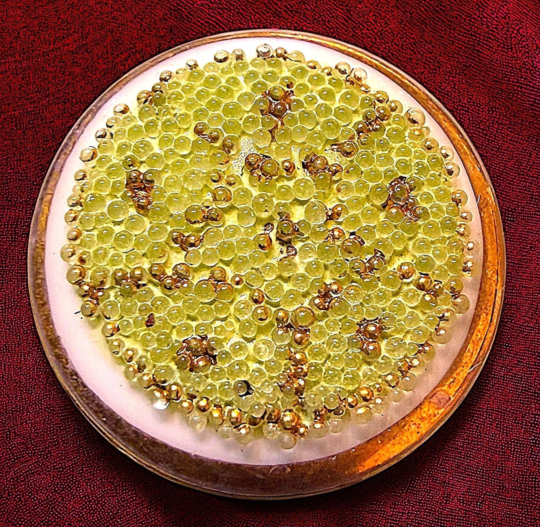 1 Small size early 20th century patterned design example. Coralene glass are typically desirable among collectors as a different technique accomplished on glass buttons. The little bumpy dots seen on the white glass base are glass balls cemented to the surface creating the design desired.