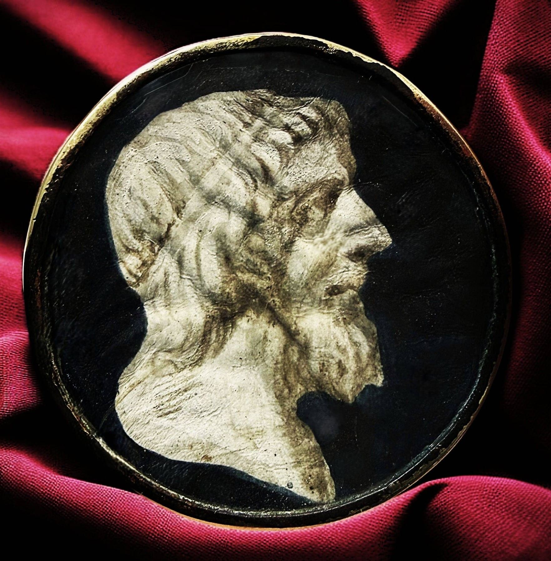1 Large 18th century slightly risque En Grisaille painting under glass! Here is a finely detailed pictorial hand painted on natural material depicting a bearded man with a very pronounced nose. He is quite amazingly detailed and in fine condition.