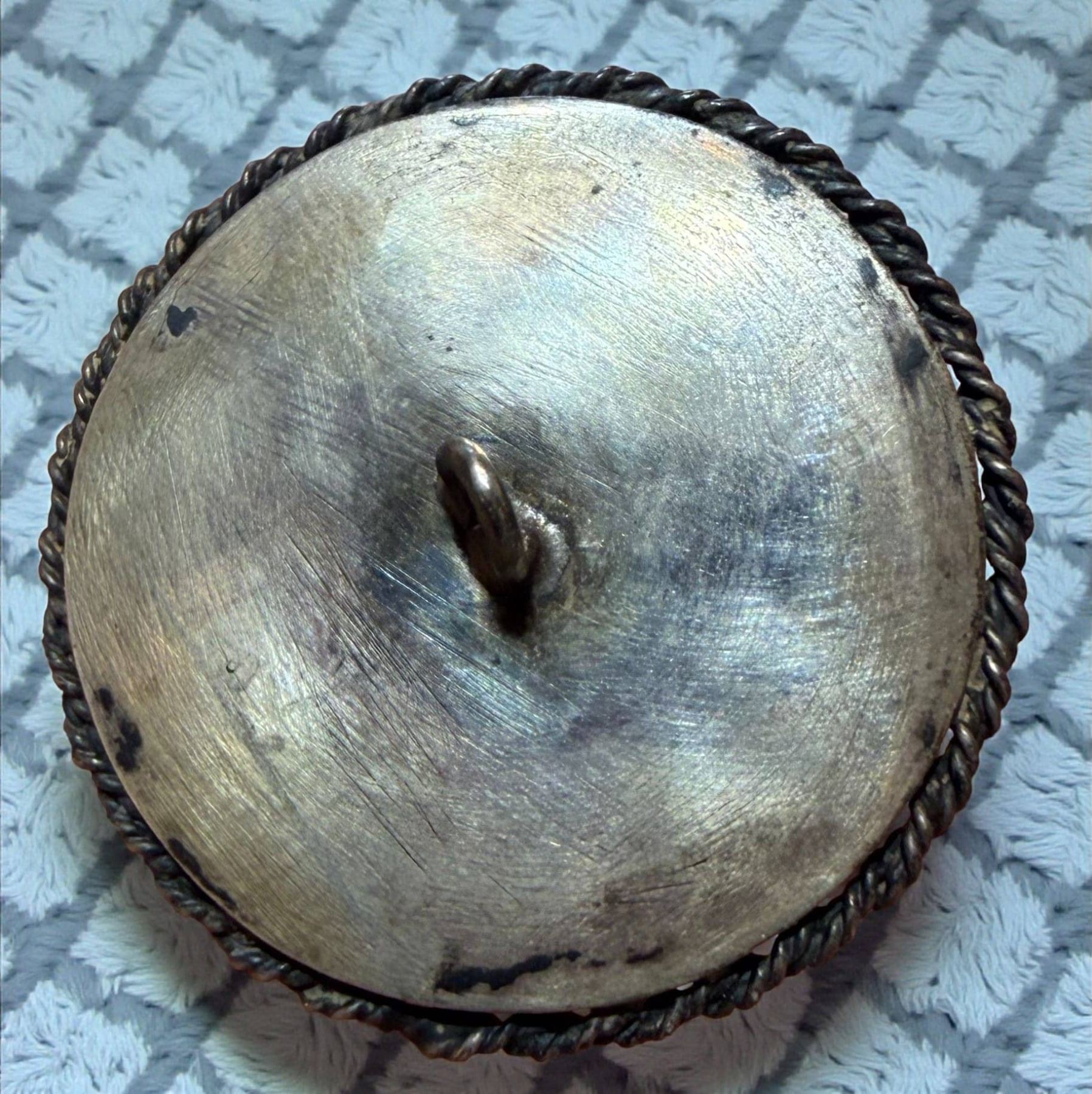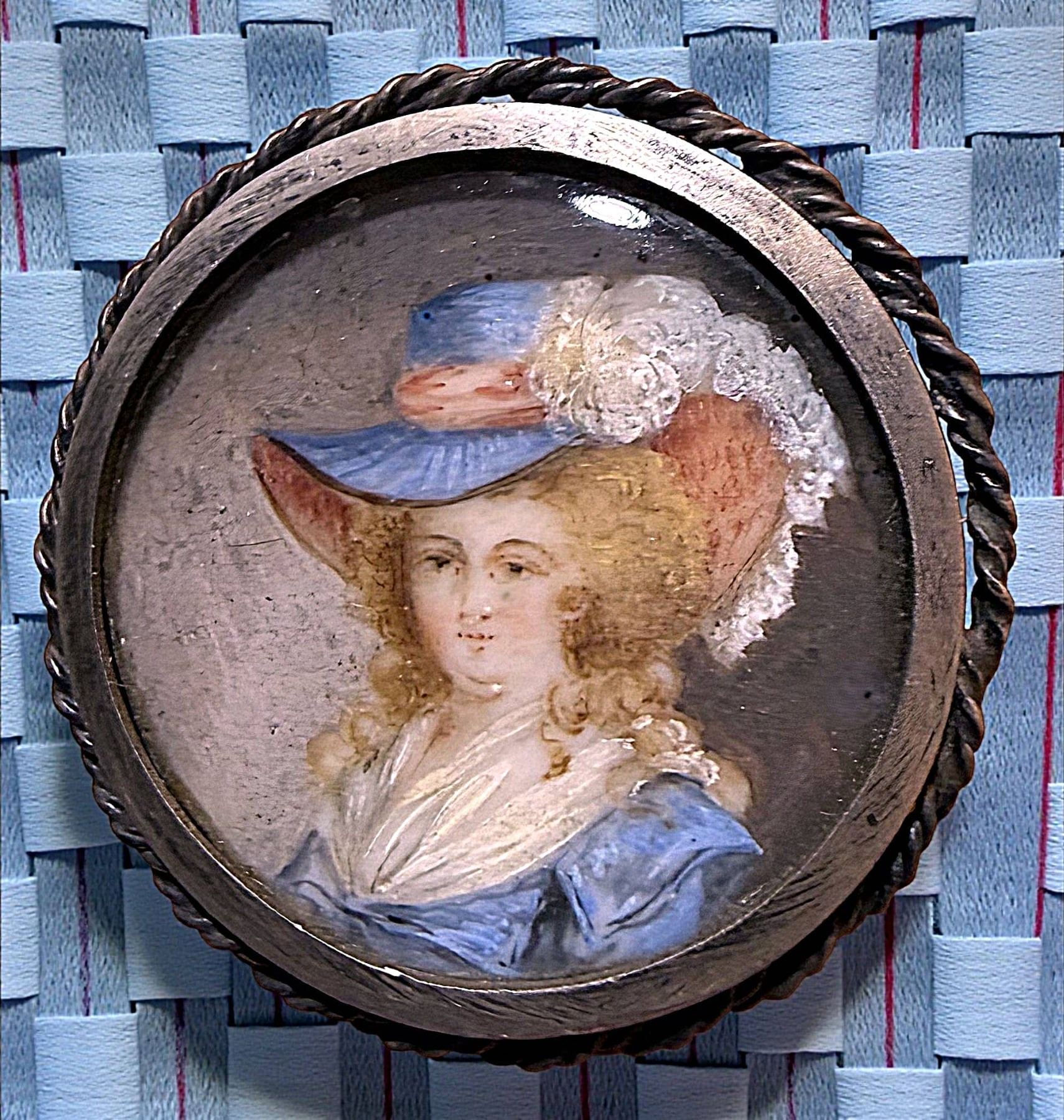 1 Large medium 19th century painting on natural material example. Just look at the expression on this young women's face, I wonder what she was thinking at the time of this rendition. The colors and fine detail on this example are truly stunning. Set under glass and in a high quality silver setting and framed with a rope twist border.