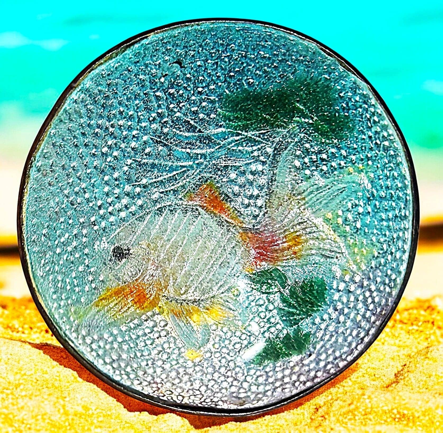 1 medium 19th century Japanese Gin Bari Button. This striking and vibrant foil under enamel button known as Gin Bari work depicts a detailed fish. I love the colors and design in this enamel set in a silver mounting.