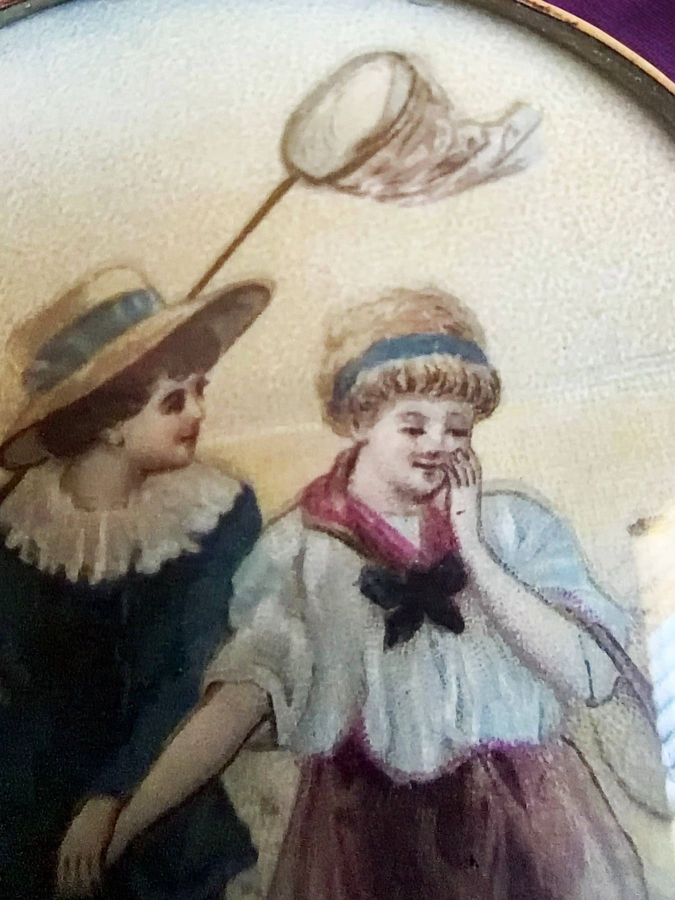 1 Extra Large late 19th early 20th C. hand painting of children. This is actually a transfer on paper under glass with beautiful hand coloring in plum and blue colorations. The depiction is of a boy and girl, either older teenage children or young adults. Whichever it depicts, it certainly is a detailed rendering with the boy and girl having charming and angelic expressions. The setting is a high quality silvered mounting.