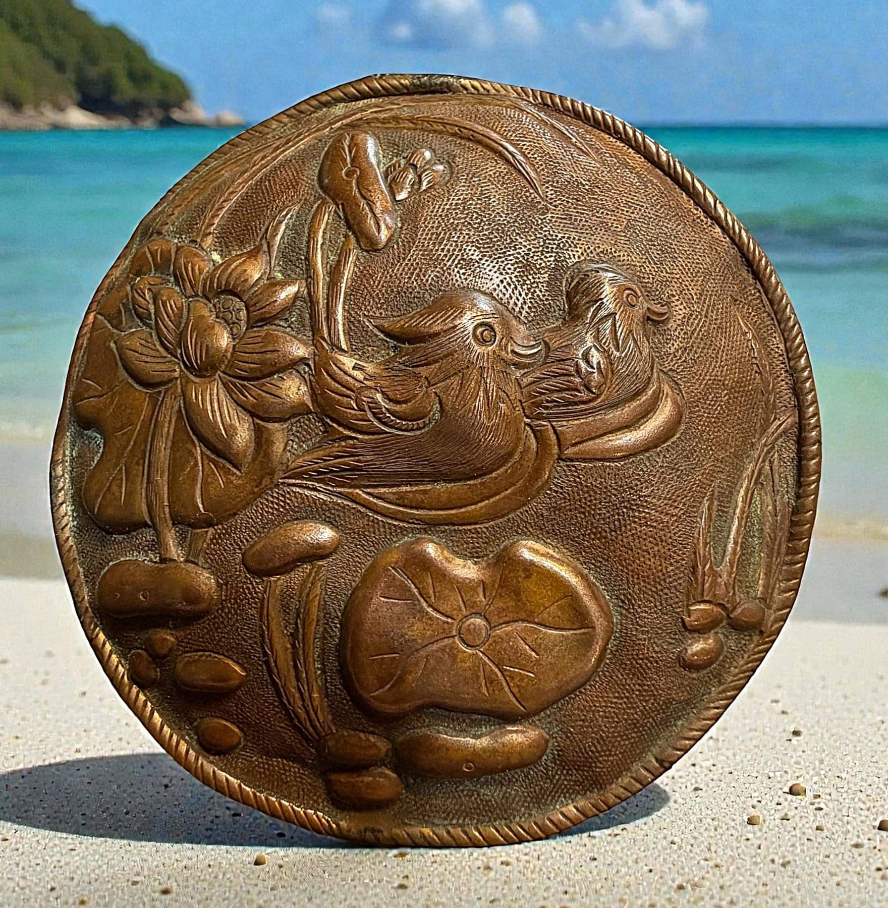 1 Extra large approx. 4" copper Chinese ducks button.