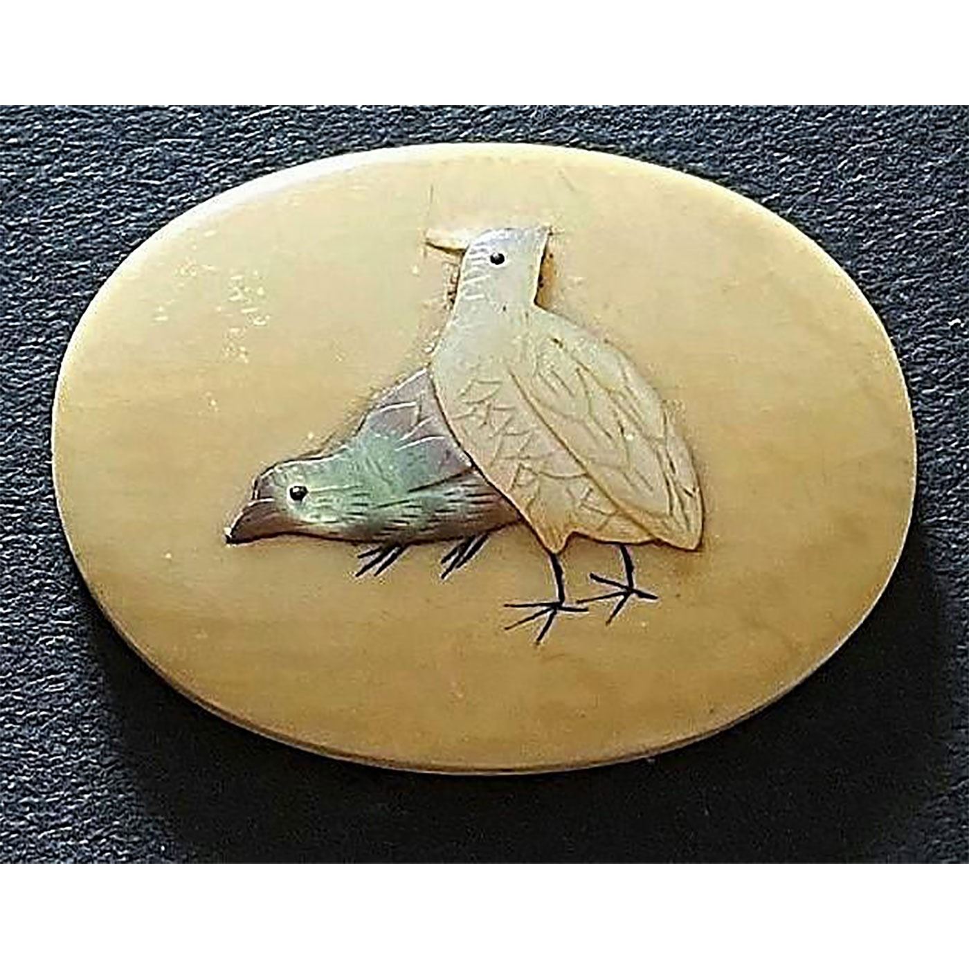 1 Large Medium scarce Shibayama Inlay partridges. This 19th century Shibayama oval with earl inlayed partridges is a very unusual example in shape and subject matter, bords are found plentifully but not Partridges. Swedged in brass shank.