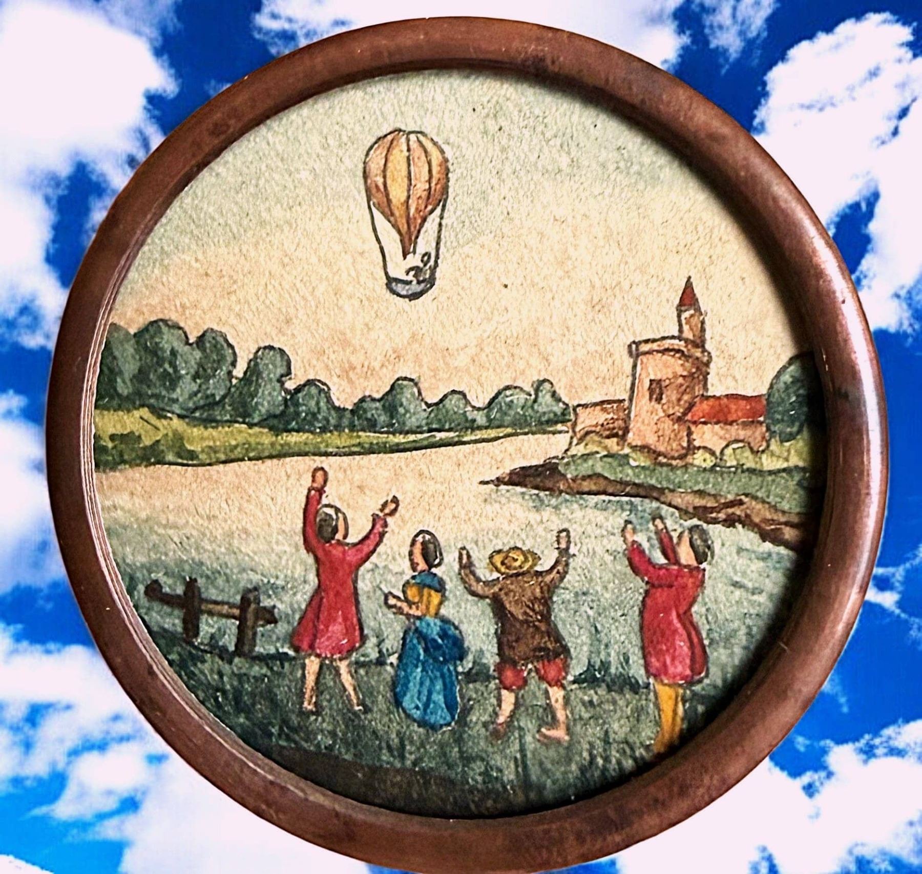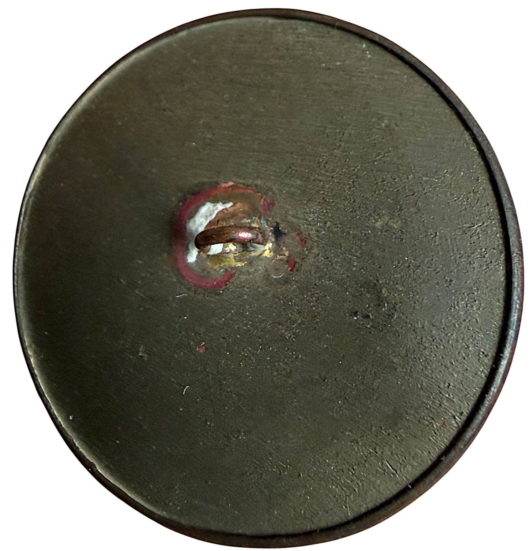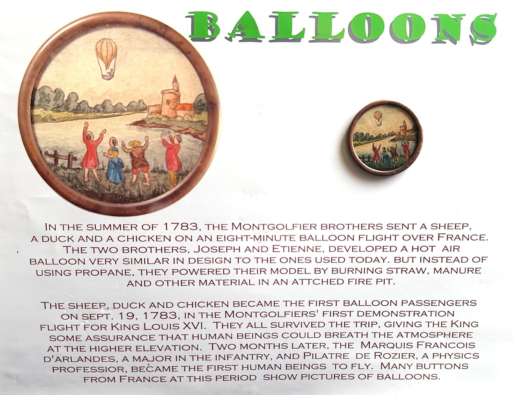 1 Large 19th C.. hand colored hot air Balloon paper example. This charming button was hand painted on paper and set under glass in a cooper rim and tin back in the 19th century as a commemorative of the Montgolfier Brothers Balloon scenes. The second image shows you detail about the ballon, compiled by the late Jeff Lee. The button will come to the buyer with his laminated card and information that he used for educational purposes.