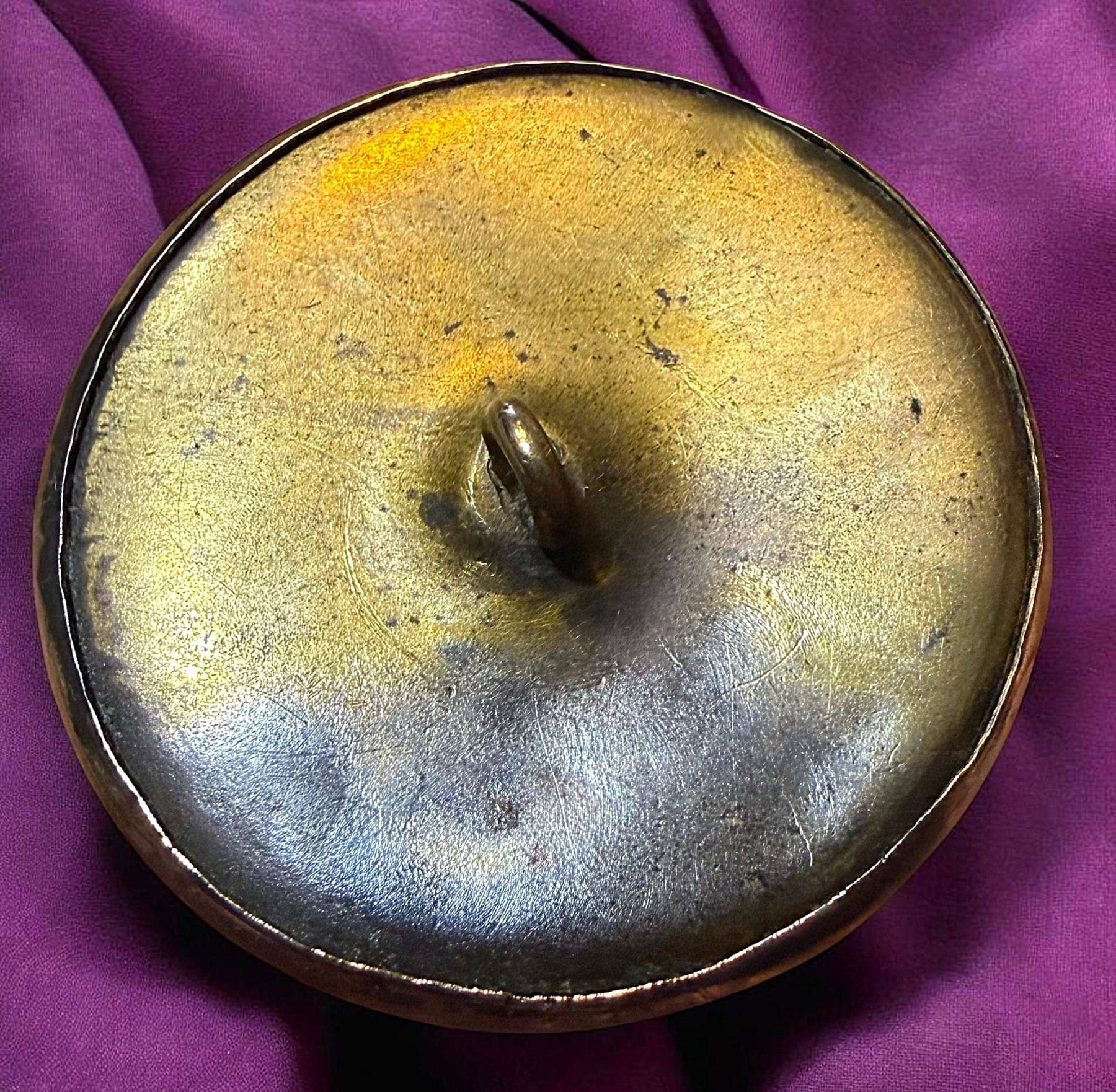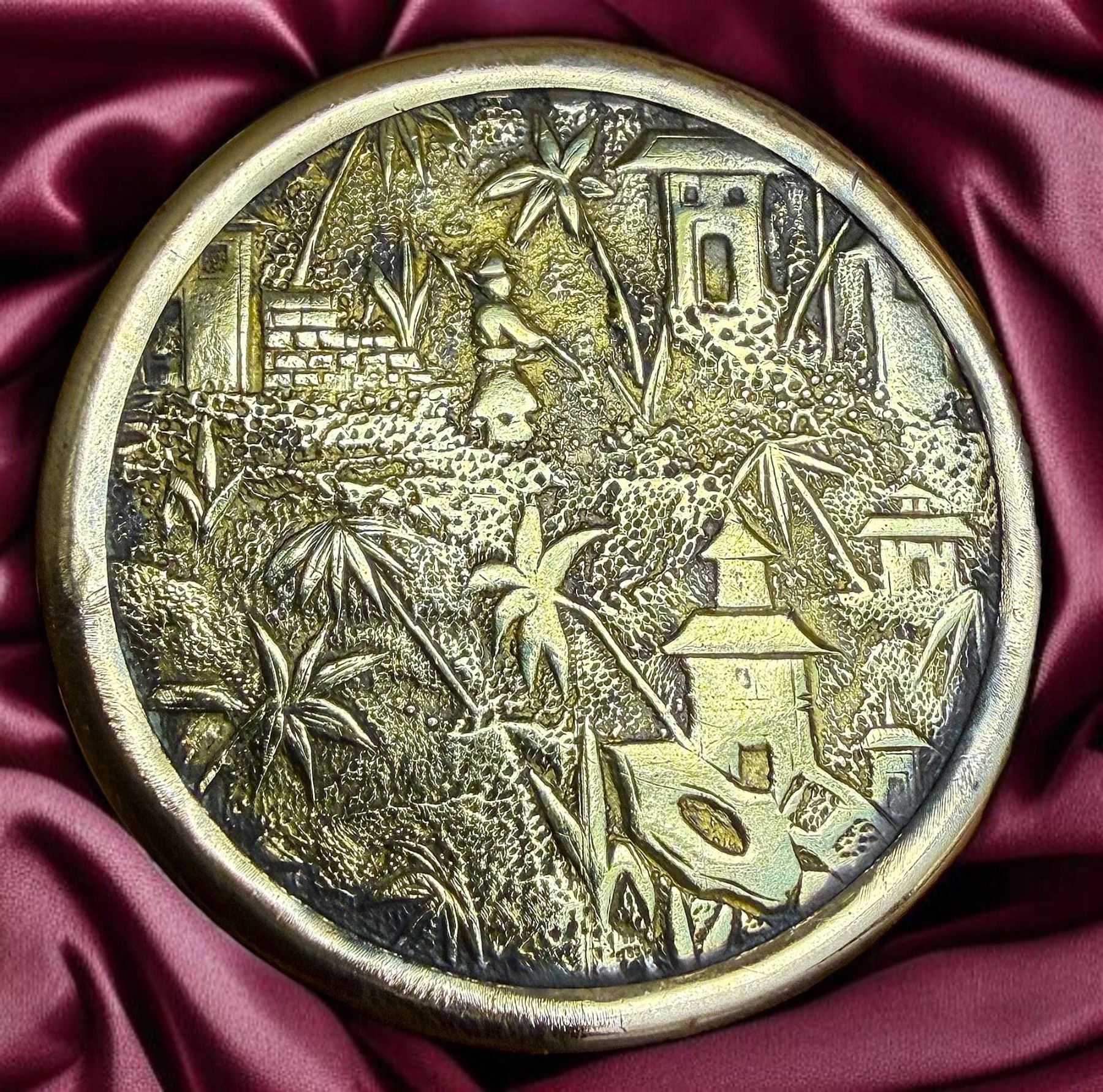 1 Large 19th century incredibly detailed scene in brass. This is quite an unusual and finely made pictorial button. The design is an all over Wallpaper Architectural/Landscaper design. Notice the person in the pictorial that you almost miss since there is so much going on here. The brass is bright, its thick and heavy and feels like one of those really high quality buttons when you hold it in your hands. A great and unusual example.