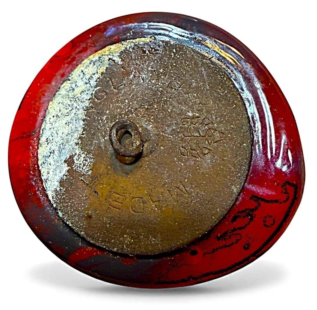1 Large 1940's RED backmarked Bimini glass example. This non pictorial example of Bimini glass is still quite stunning in its design and gold lustered finish. Red is a less common color to find in Bimini glass.