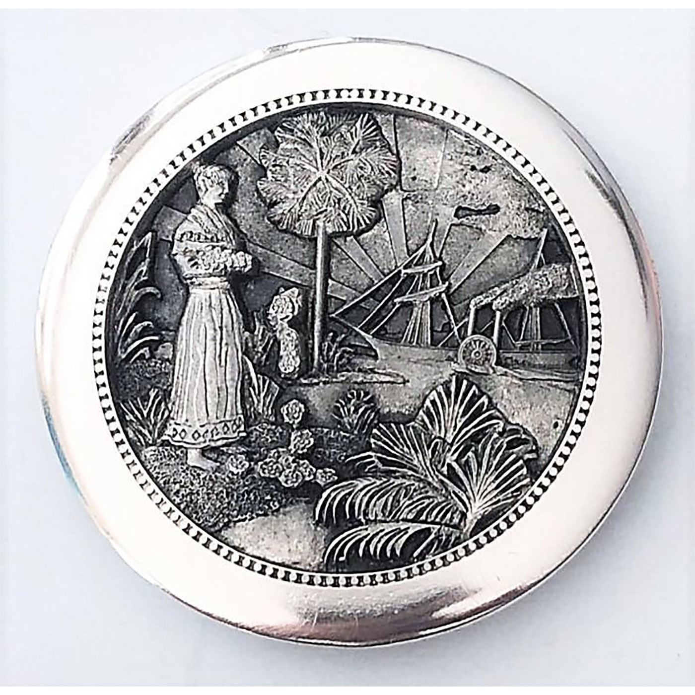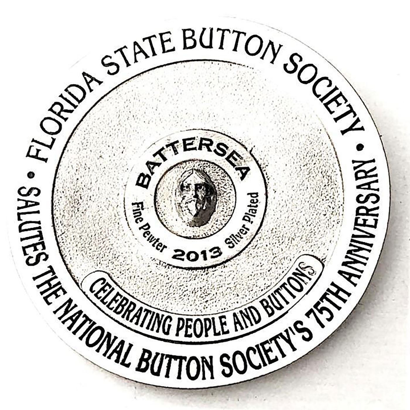 1 Extra large pewter with silver late button with face shank. For those who don't know him the face on the shank is Daniel Baughman the owner of Battersea pewter company. This extra large button was made for the 2013 Florida state button show as witnessed by the image of the back.