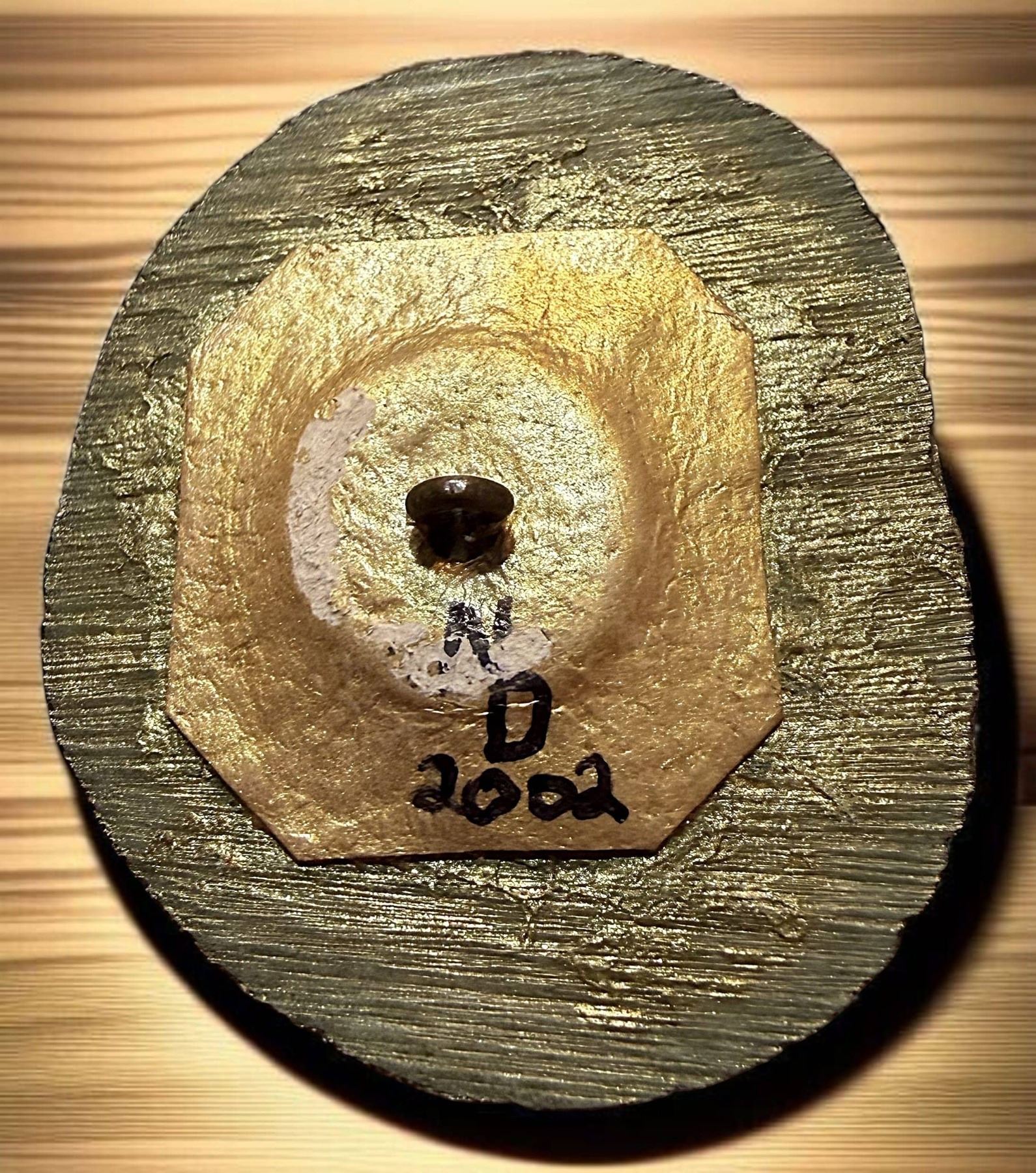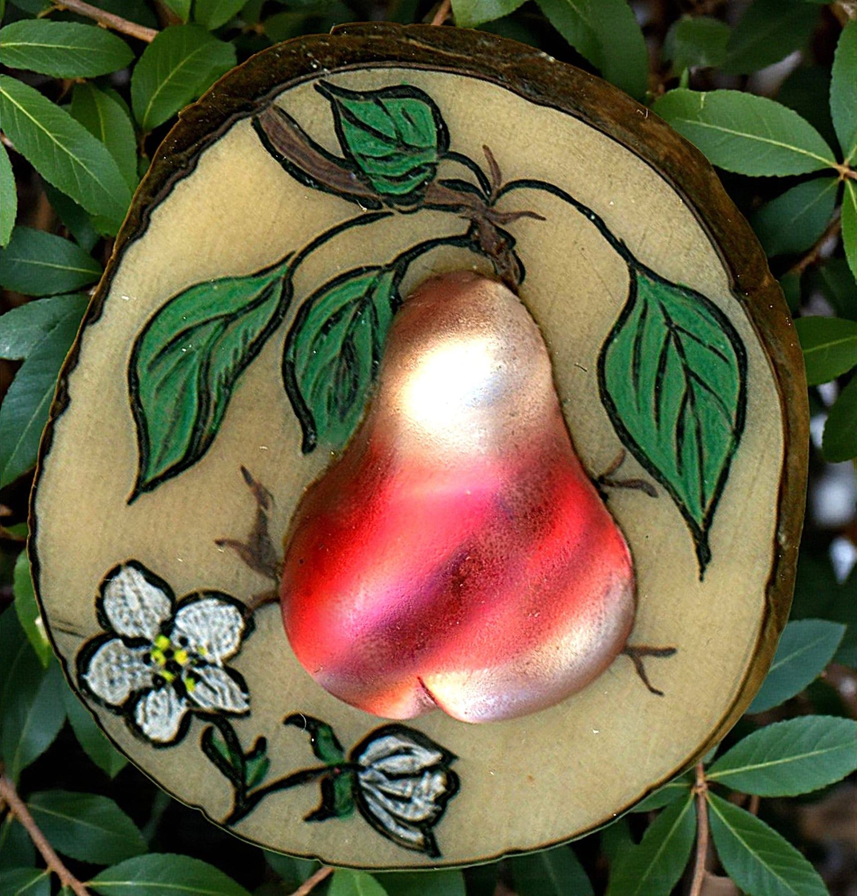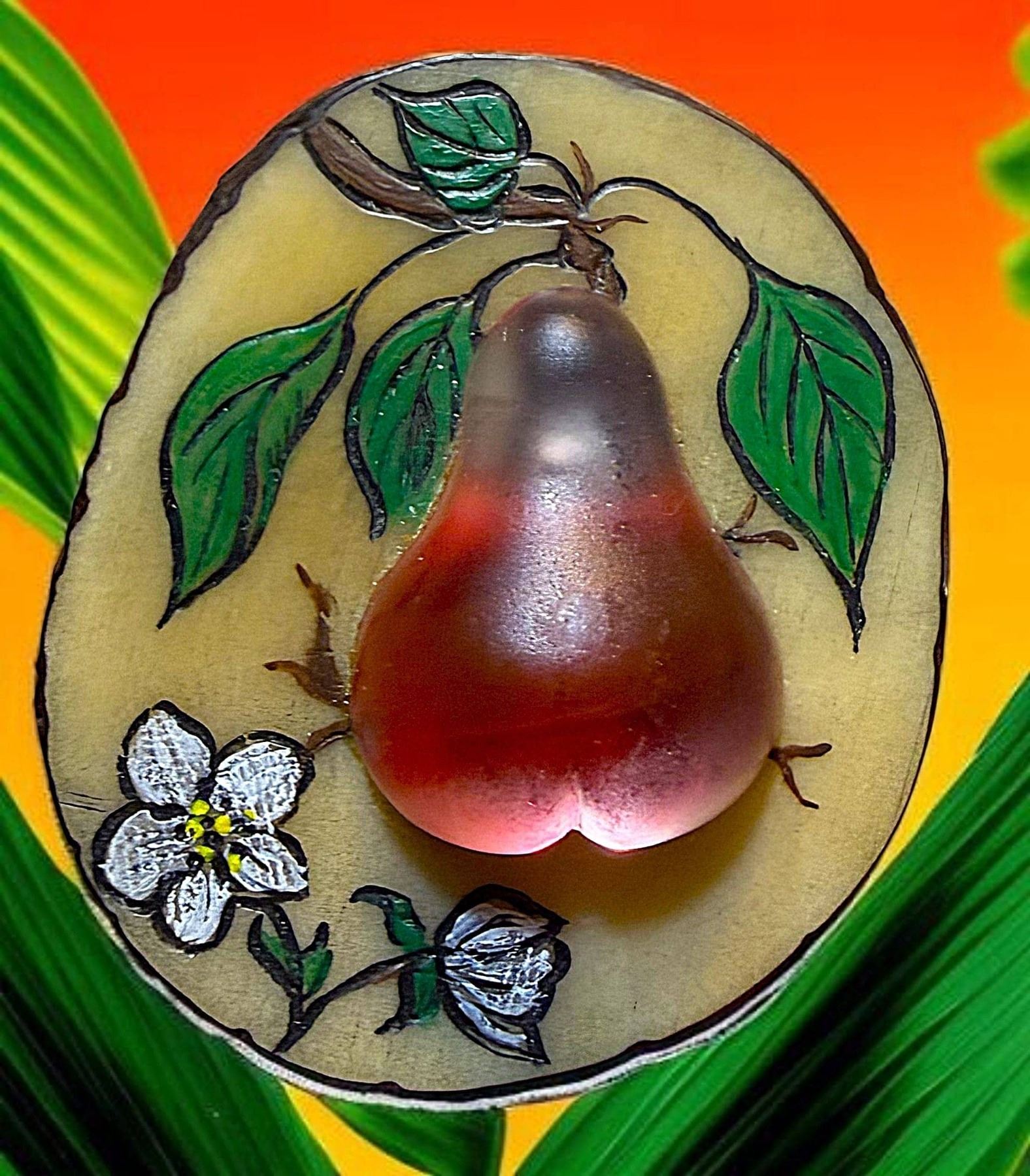 1 Large 21st C. VI & Glass by Nancy Dubois. Here we go again with a talented artist of our times. This incredible Veg. Iv. Shaped button was hand made by Nancy Dubois of New Jersey, engraved, paint DF and a blown or hand made nice quality shaped pear piece of glass that she also made, applied to the top. Lots of detail and work as Nancy is known for doing. From the collection of Nikki Deal.
