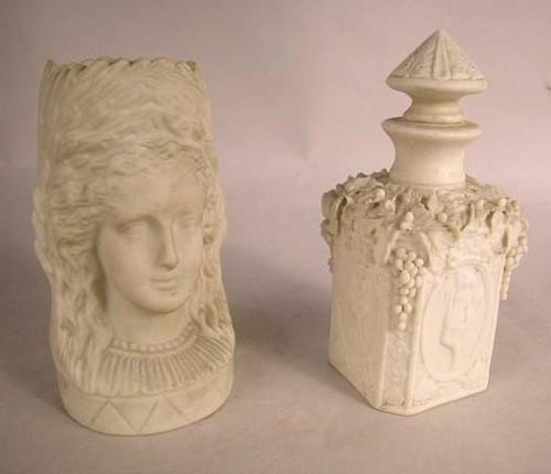 A DOUBLE FACED PARIAN VASE; 5-1/2"h, together with a Parian stoppered decanter with applied grape leaf and figured motif, 5-3/4"h, losses