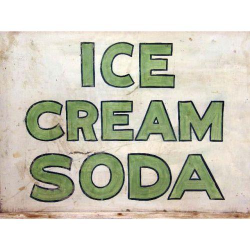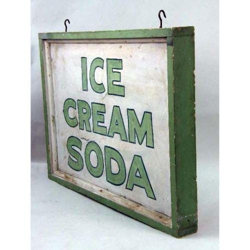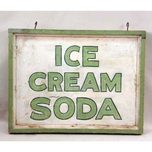 A DOUBLE-SIDED "ICE CREAM SODA" SIGN<BR><BR>probably 1920s. Wear and losses to paint, one side more heavily than the other. 19 3/4" h x 25 3/4" l x 2 3/4" d.