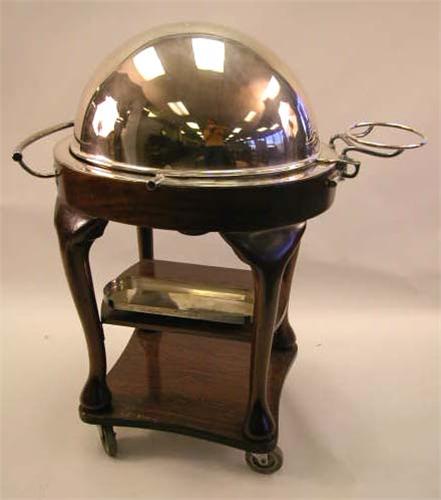 A DRAKES SILVER PLATED AND MAHOGANY BUFFET CART; Of Brewster Street, London, Model # MIN, No. 1890, the retracting dome lid opening up to a well and tree warming platter, now fitted with platform, stretcher and wheels 43"h x 38"w x 21"d