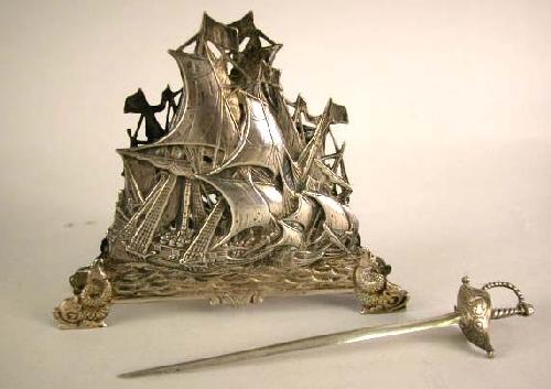 A DUTCH SILVER SHIP FORM LETTER HOLDER; Together with a sword-form letter opener, letter holder 4-1/2"h, total apx. 4 T.O.
