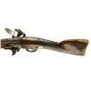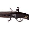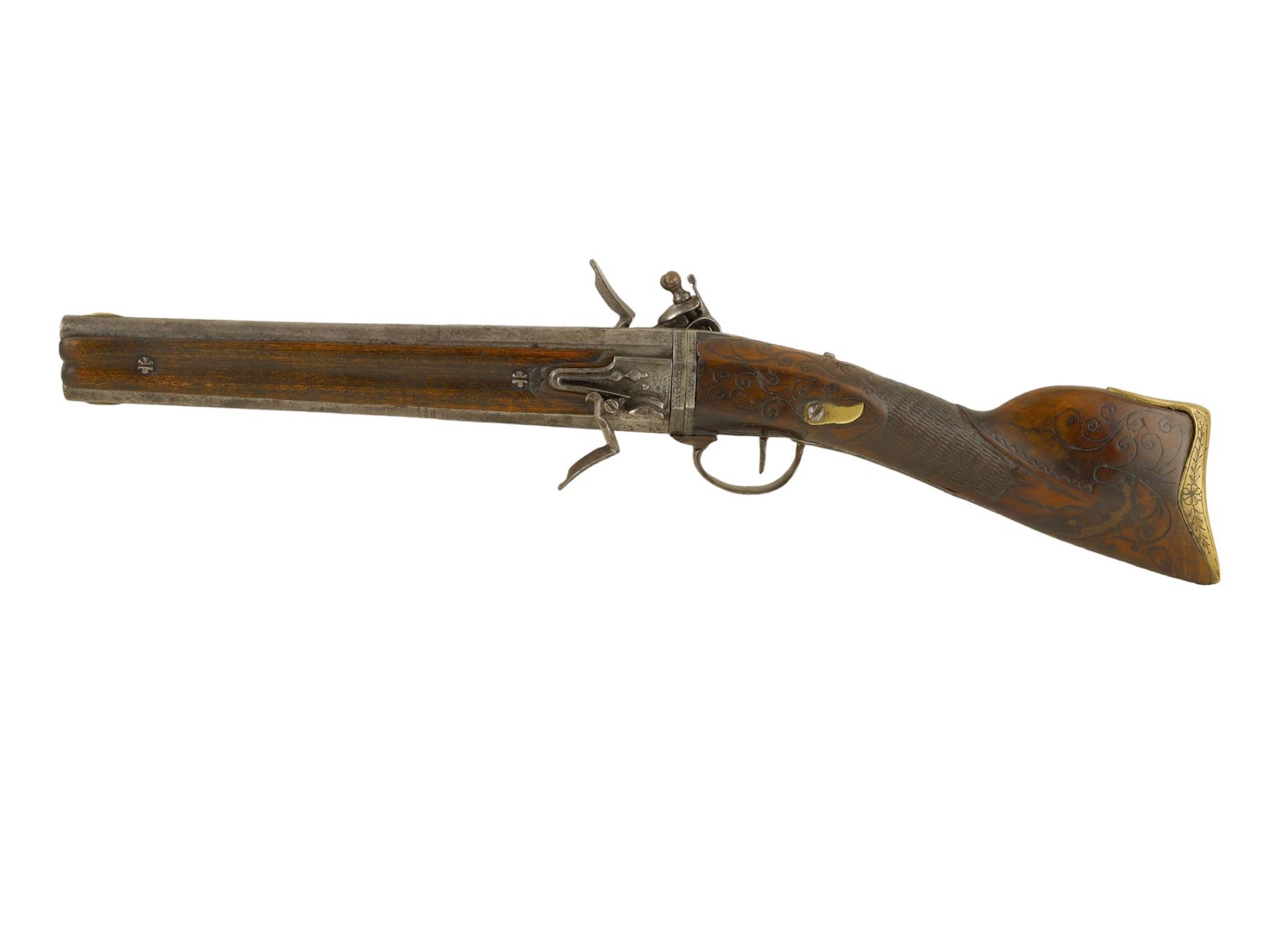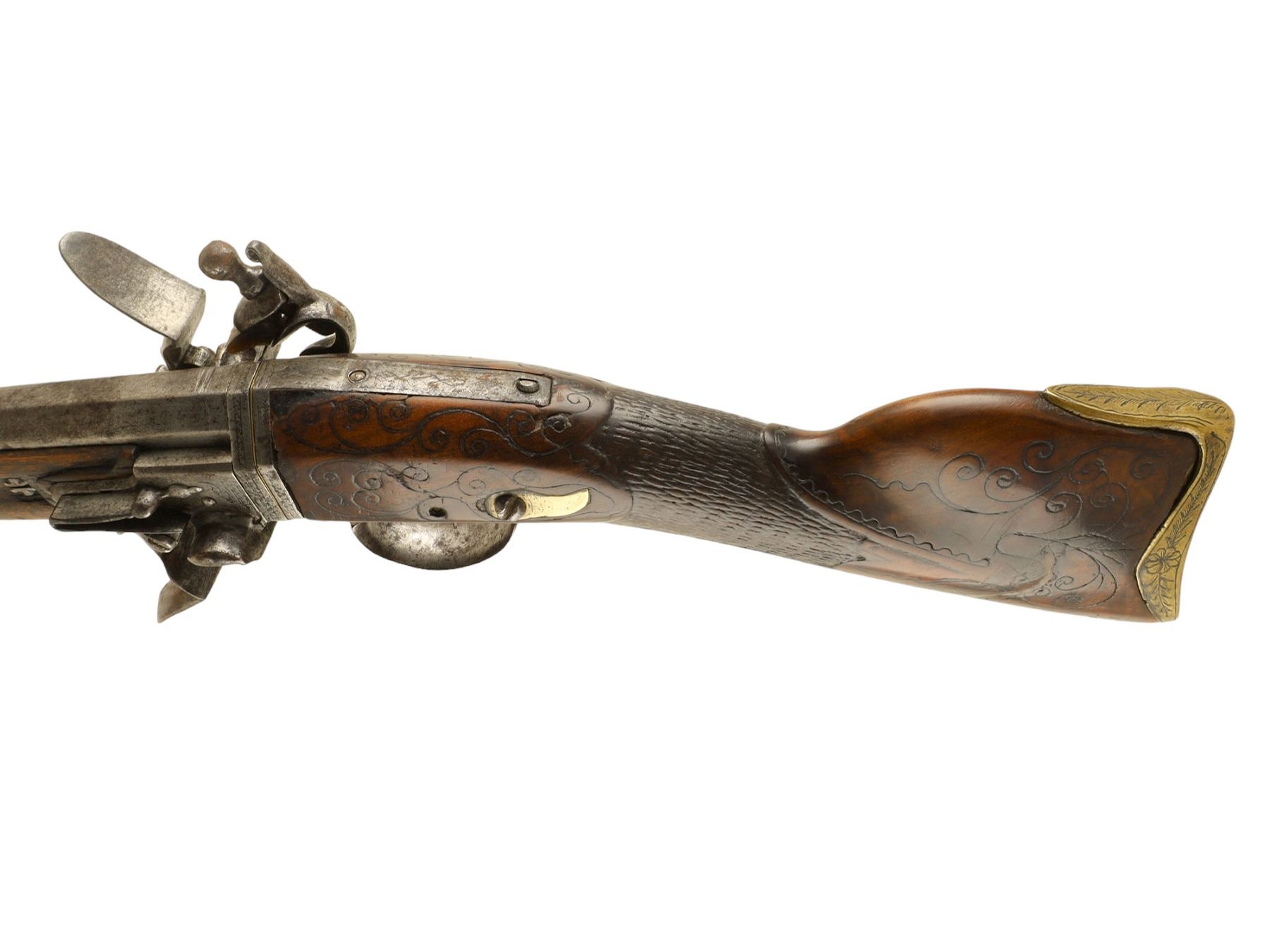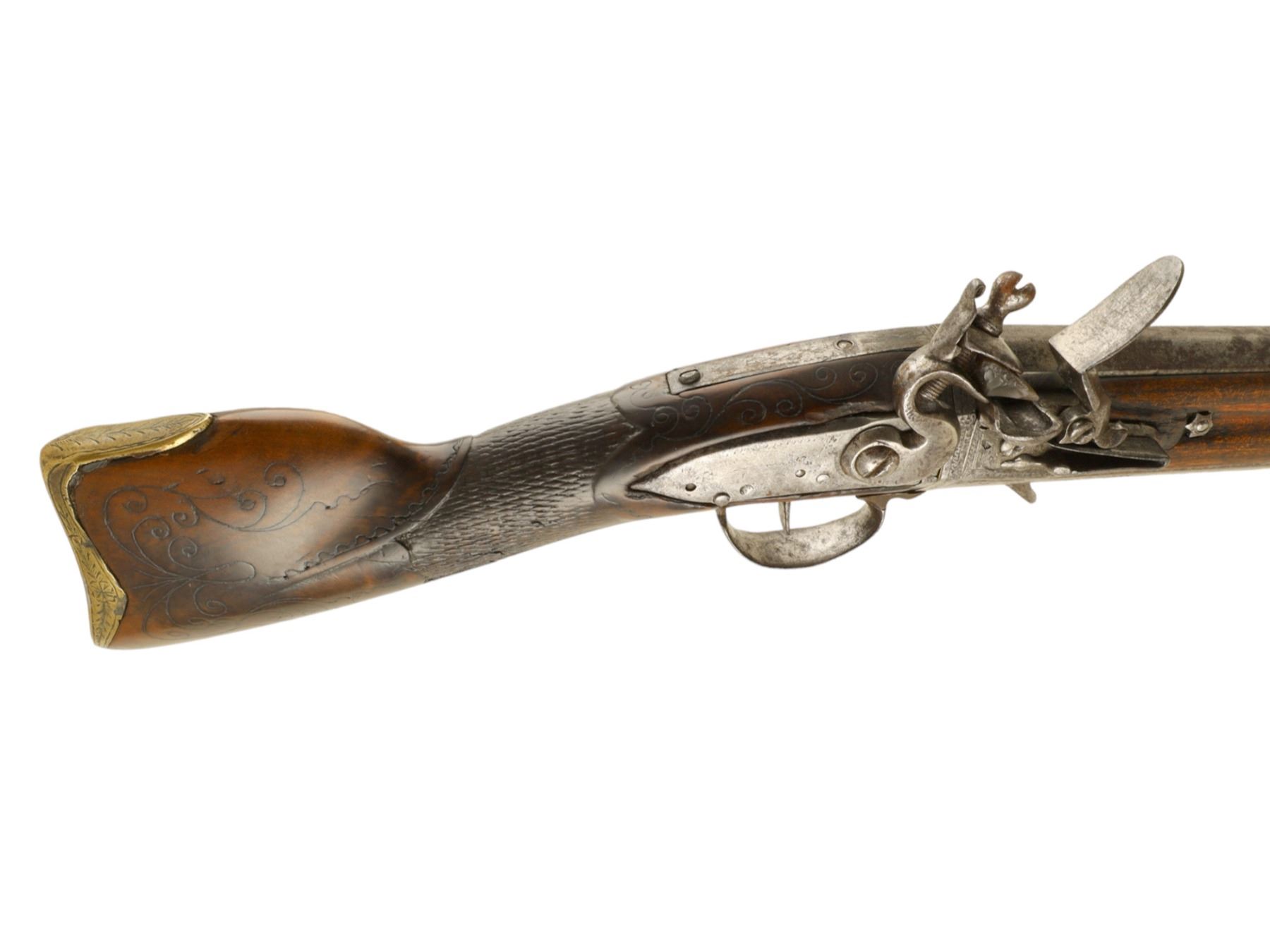 The design of this unique flintlock blunderbuss made for two barrels of attack. After the first shot, the entire barrel assembly could be turned over 180 degrees to immediately fire a second shot. The lockplates and barrels are engraved. The walnut stock is carved and mounted in engraved brass.