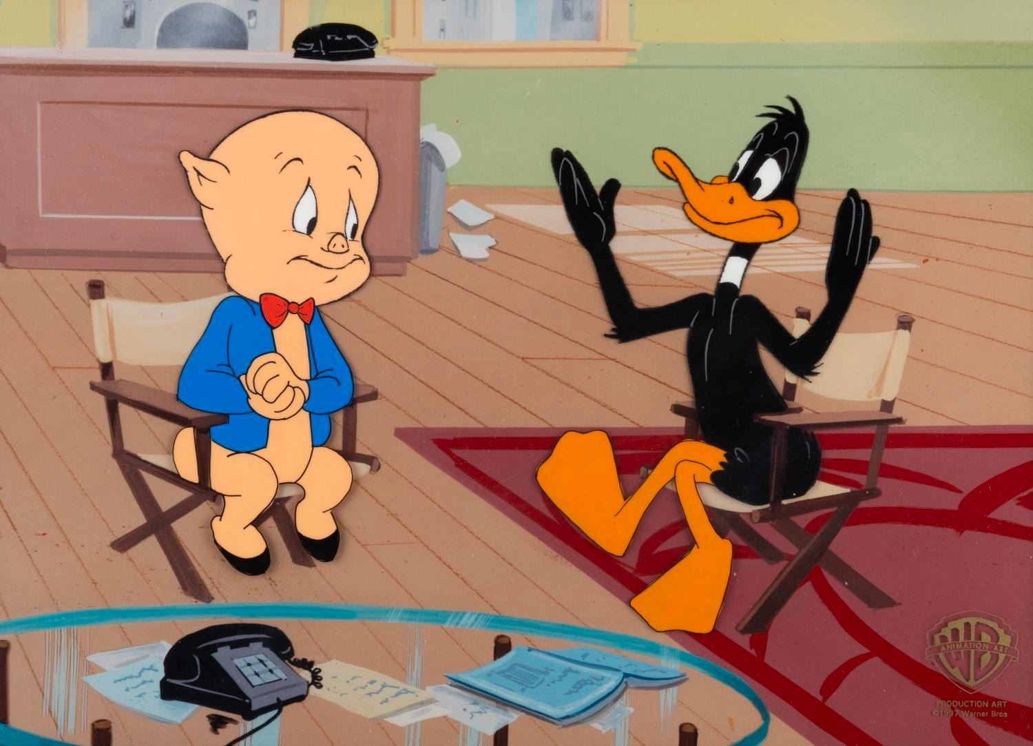 (Warner Bros., 1988) An original production cel of Daffy Duck and Porky Pig from “Daffy Duck's Quackbusters.” With a character image size of 5.5” x 7” on a 7.75” x 10.75” visible cel, in a 14.25” x 17” frame and matte, the cel is in fine condition, presented with a reproduction color copy background.