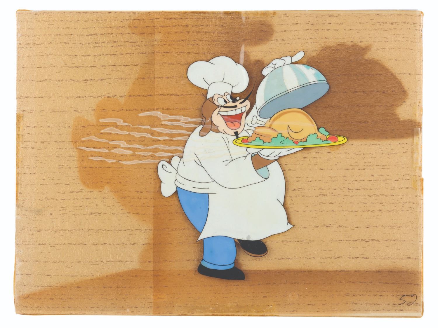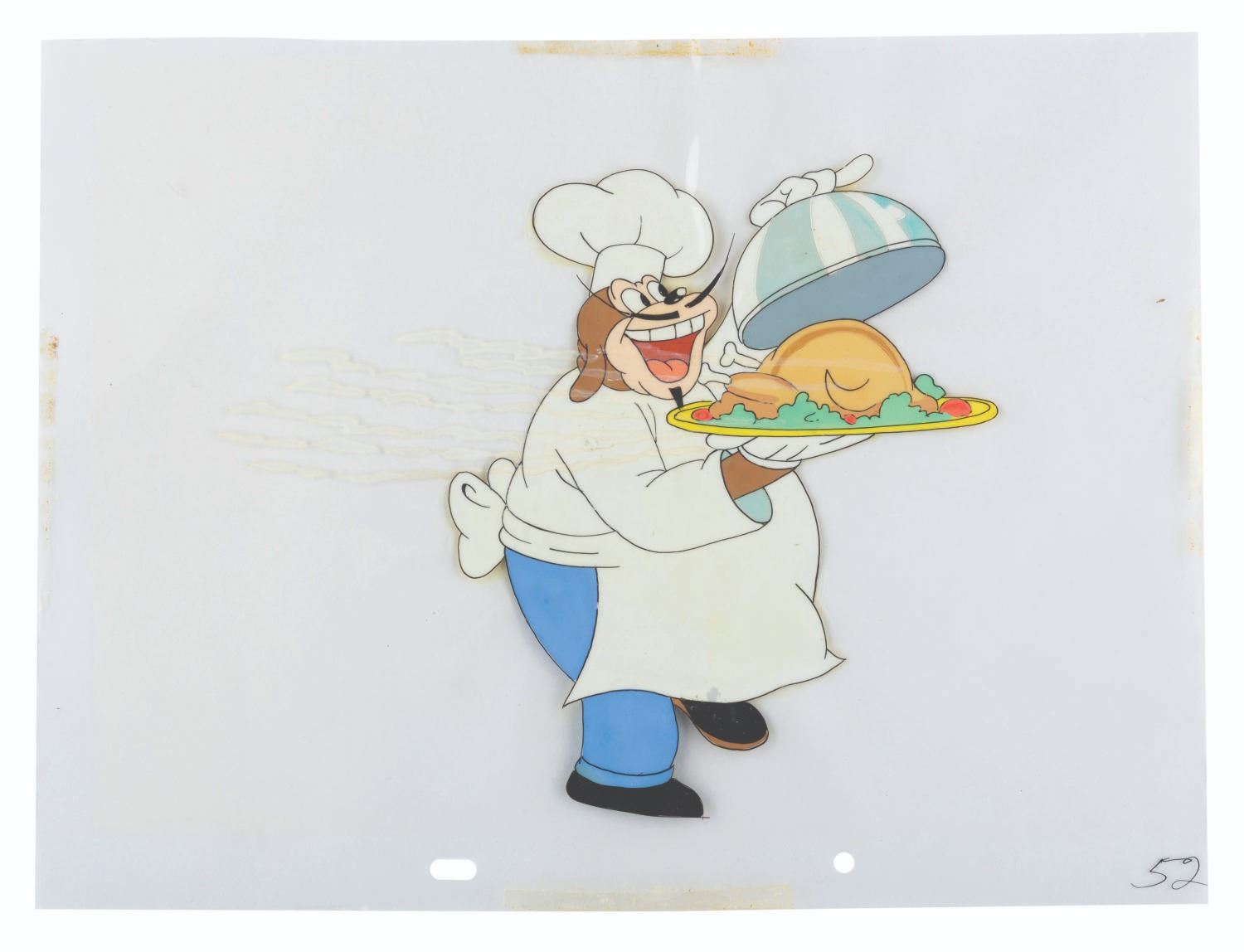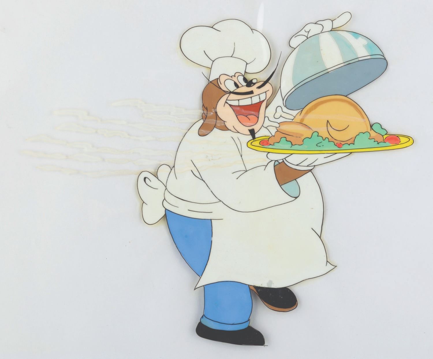 (Schlesinger, 1938) An original production cel of the chef from the Merrie Melodies cartoon “Daffy Duck in Hollywood,” directed by Tex Avery. The cel was paired with a custom background with the steam effect added, most likely for sale at the time. With the original cel trimmed to the character image size of 7.75” x 7” and applied to a 9” x 12” cel and background, the piece displays in very good condition with slight waviness from age, and some very small spots of paint lifting.